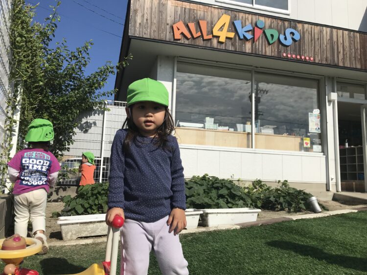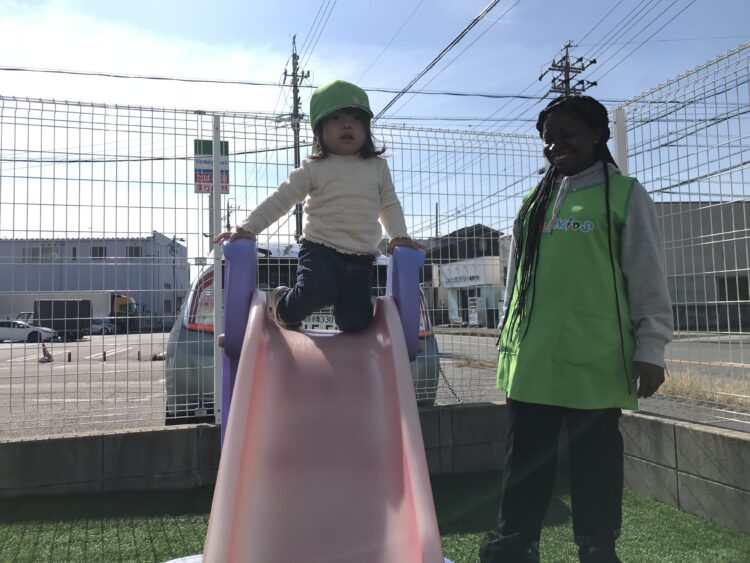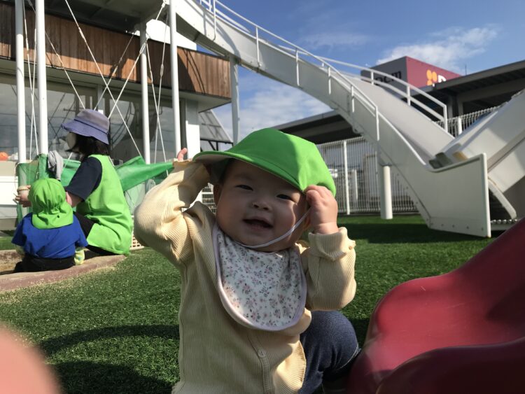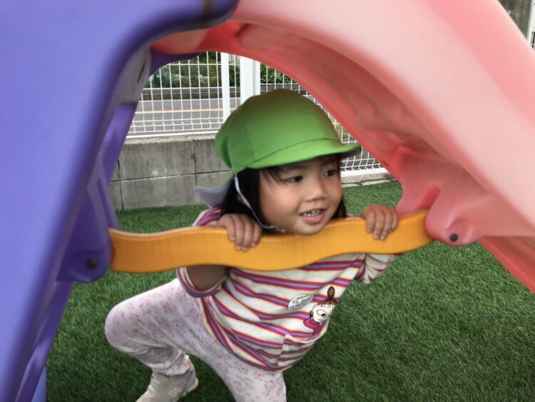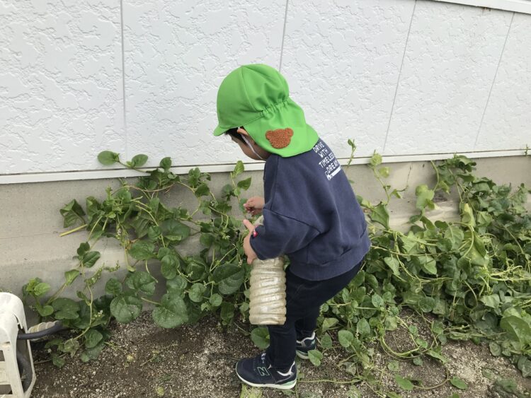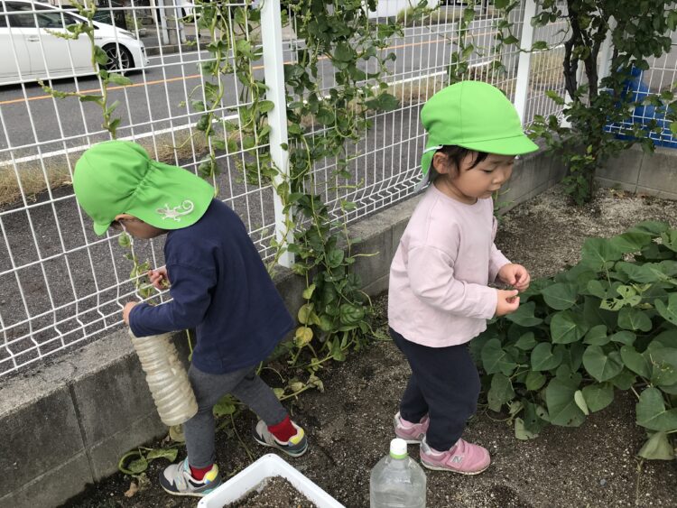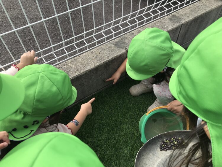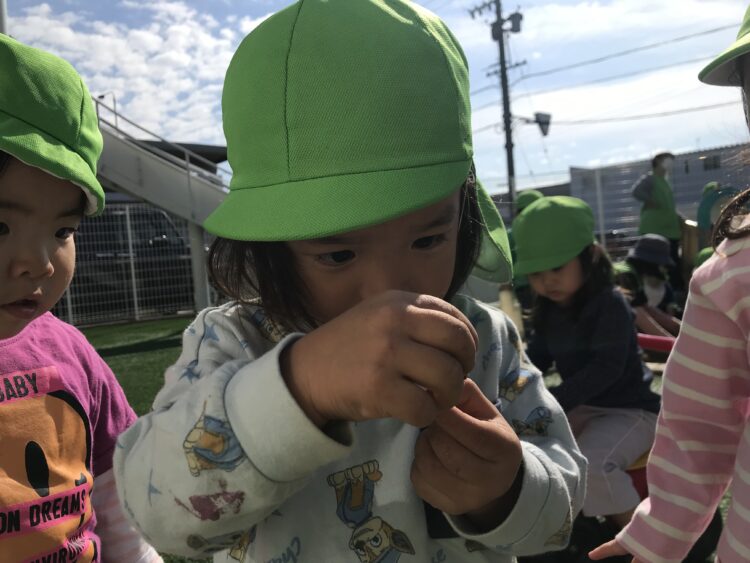 最近は園になっている木の実をとるのが流行りです😊  滑り台の下でお店屋さんごっこ🍦  茶色いバッタが園庭に遊びにきており、興味津々の子どもたち😊たくさん遊んで楽しかったね😊