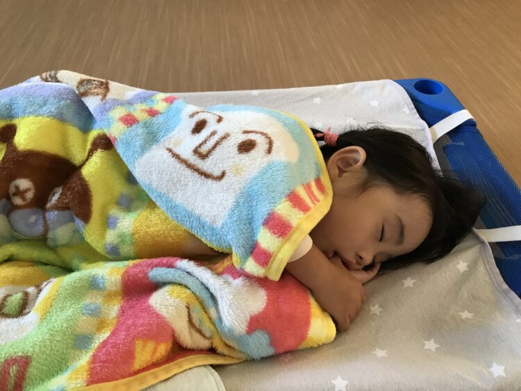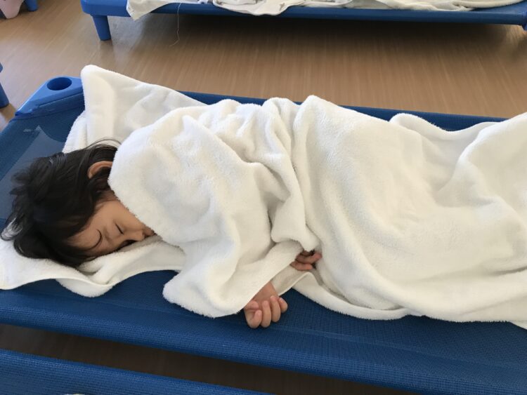 体操して、外でもたくさん遊んで、たくさん給食を食べたあとはお昼寝💤 午後もたくさん遊ぼうね😊
