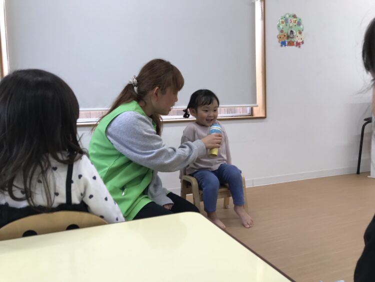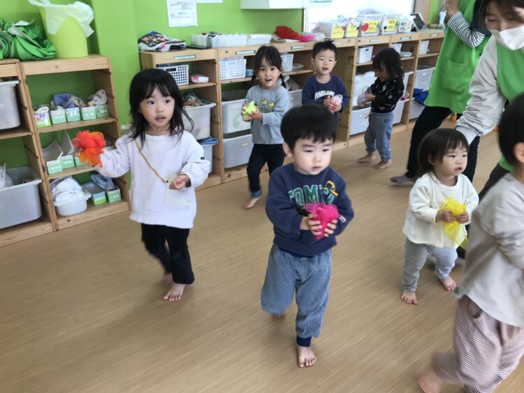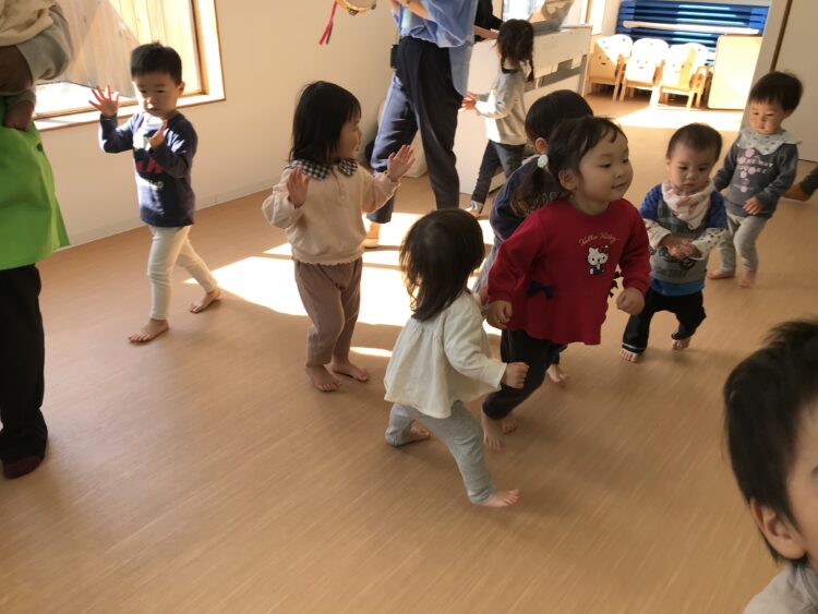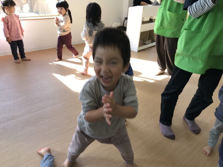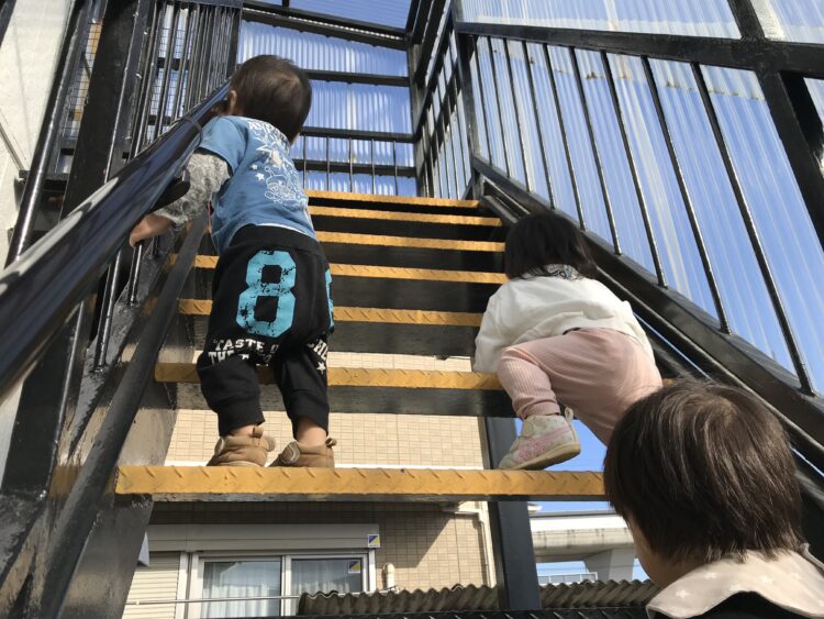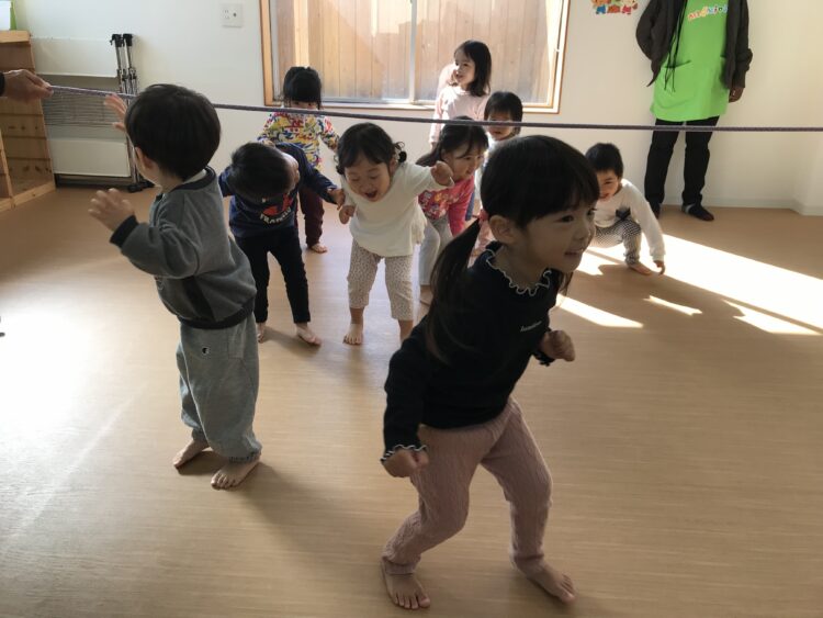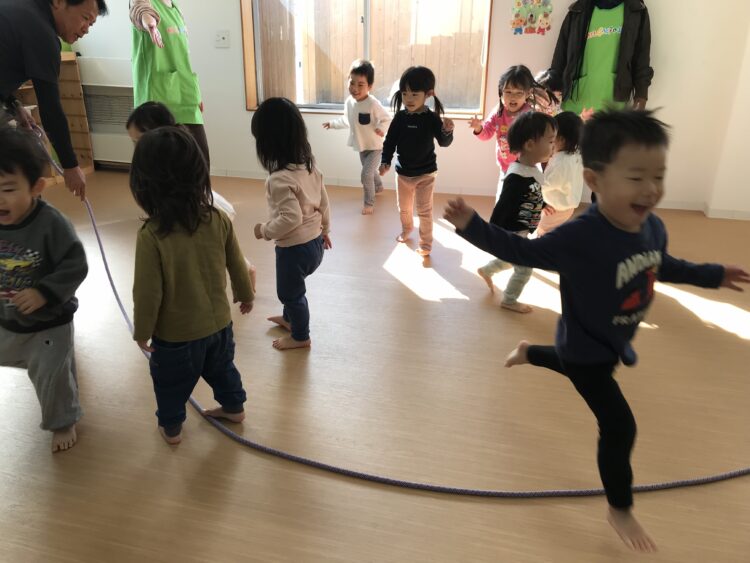 2階で行うので、一階のお友達は保育士と共に自分で頑張って階段を登ってきてくれます💪 今日の体操は向かってくる縄をジャンプしたり、屈んだりして、避けてみます!