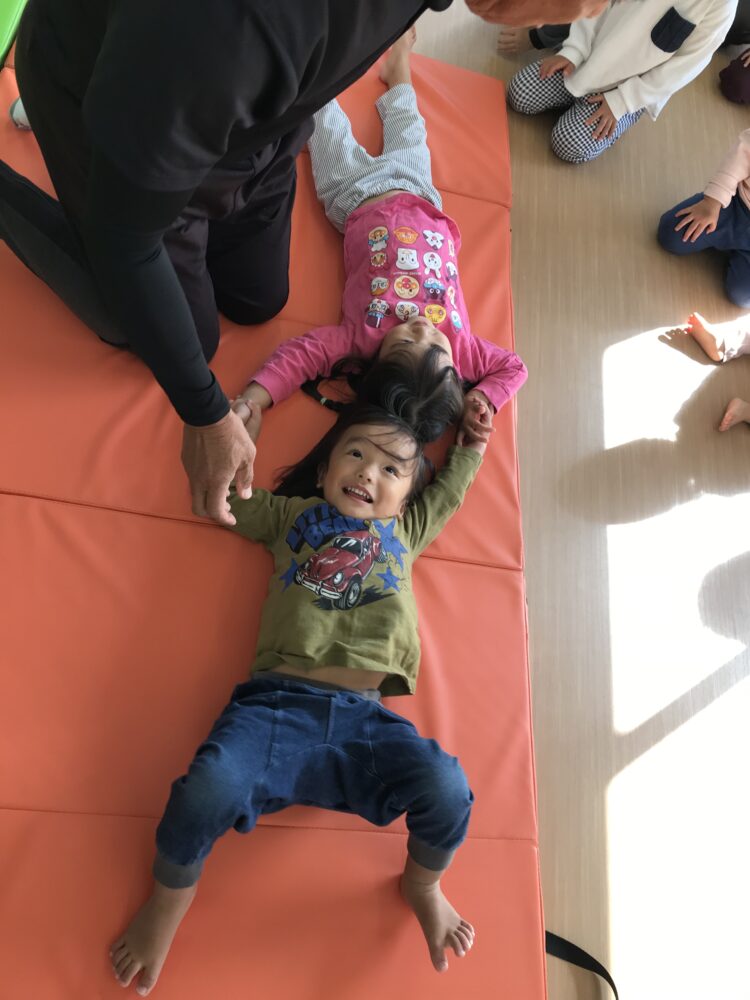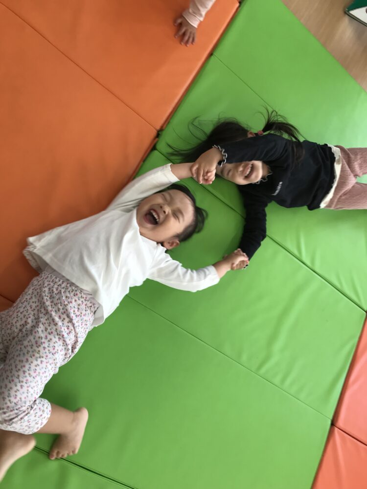 縄の上をジャンプ!したり 潜ってみたり、縄に当たらないように注意しながら避けます😊 次はお友達と手を繋いでマットの上をゴロゴロ!