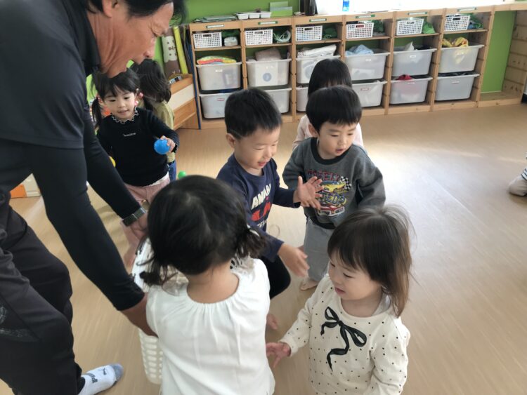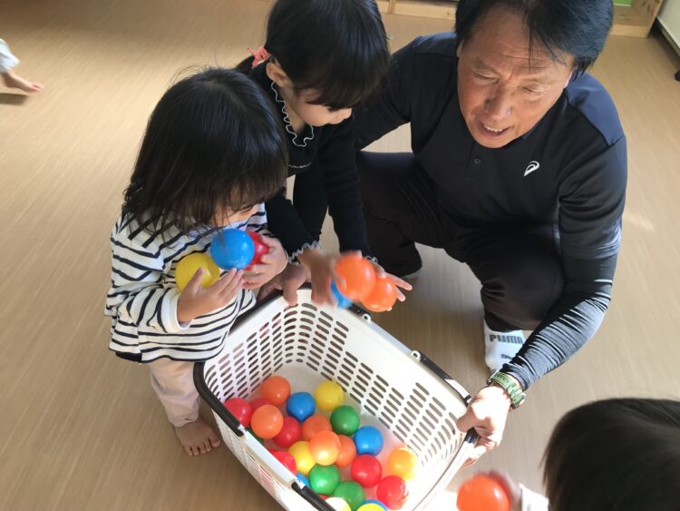 次は部屋中のボールをみんなで協力して籠の中に入れました! 今日の体操もとっても楽しかったね🎶