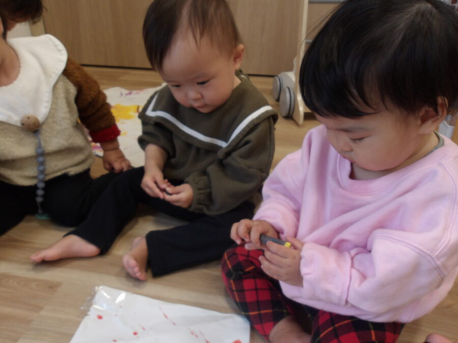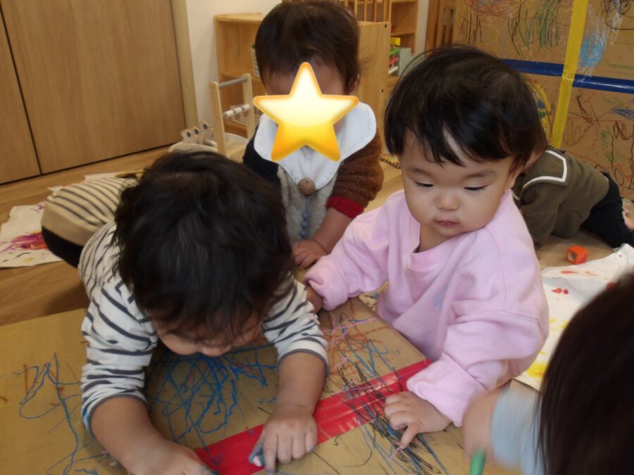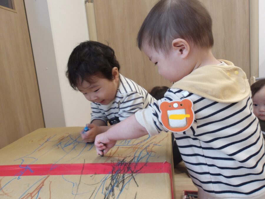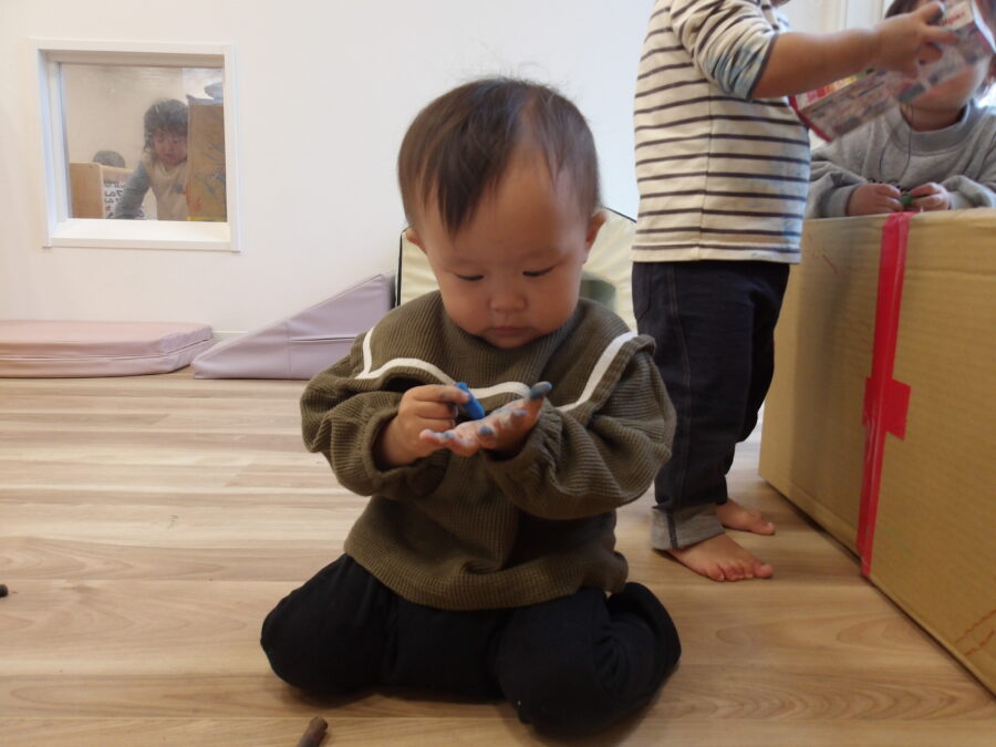 自分の好きな色のクレヨンを選んでいました!トントンと叩いて描いてみたりグーっと長い線を描いたりいろんな描き方をしていました