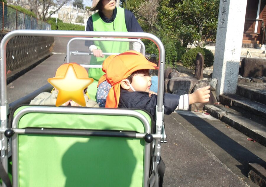 「あ!!」とお地蔵さんを発見!頭をペコペコしてこんにちは〜!バイバイと手を振ってまた来るね〜のご挨拶ができました