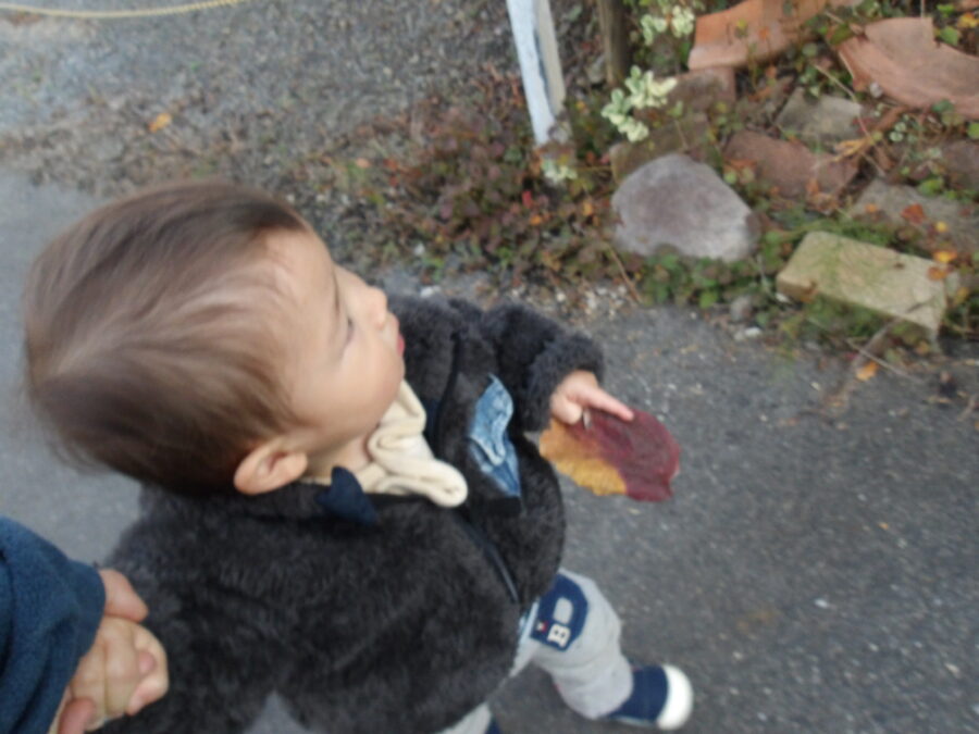 赤い葉っぱを見つけて嬉しそうに帰って持って来ました♪