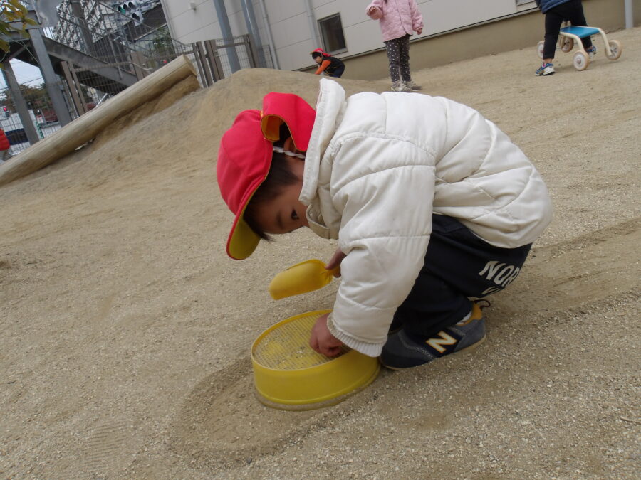 園庭の砂をシャカシャカの中に入れて小さな石を作っていましたよ