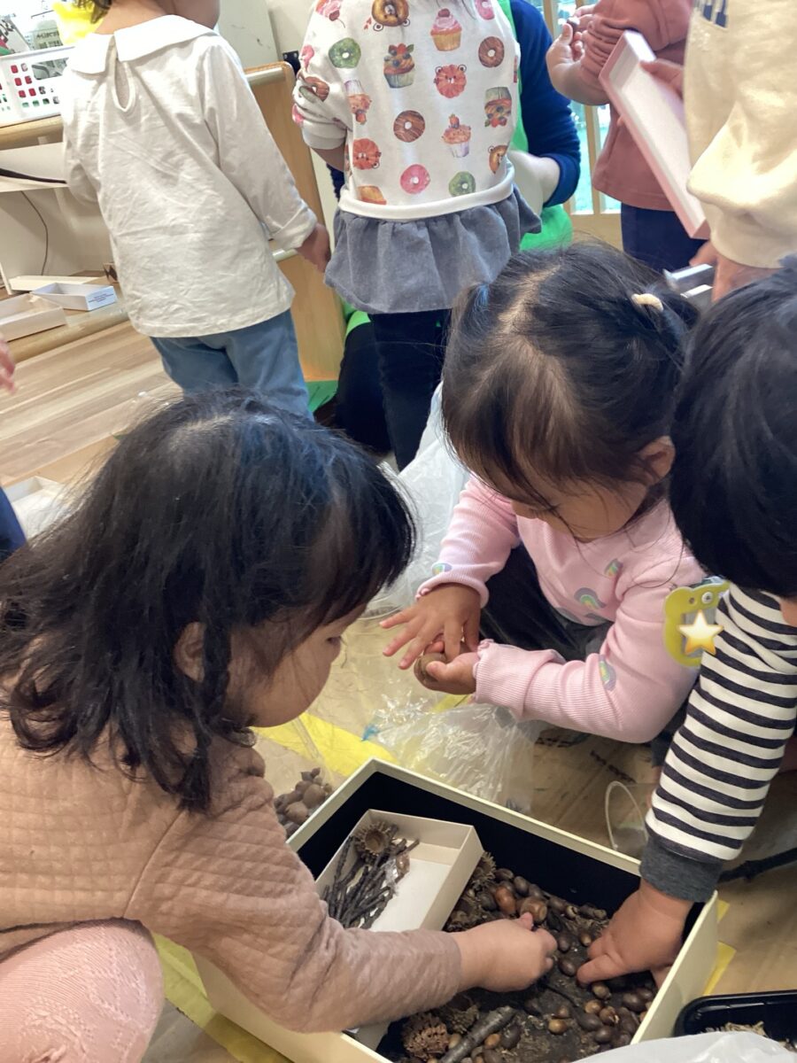 今回は、どんぐりころころや焼き芋グーチーパー、小さな秋、むすんでひらいて、大きな栗の木の下で、を皆で歌って手遊びを楽しみました