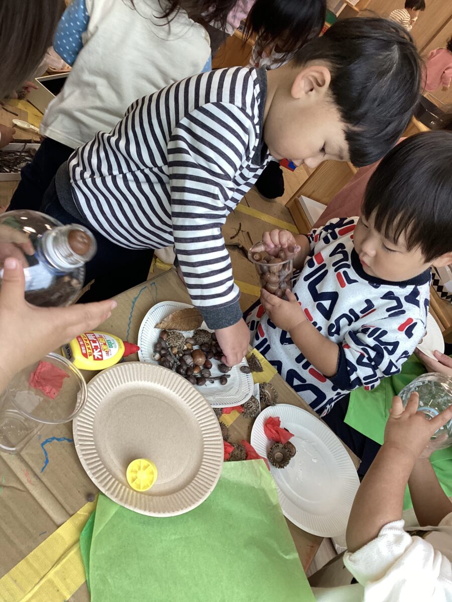 クレヨンでお絵描きをしたり、木の実を貼ったりしました!