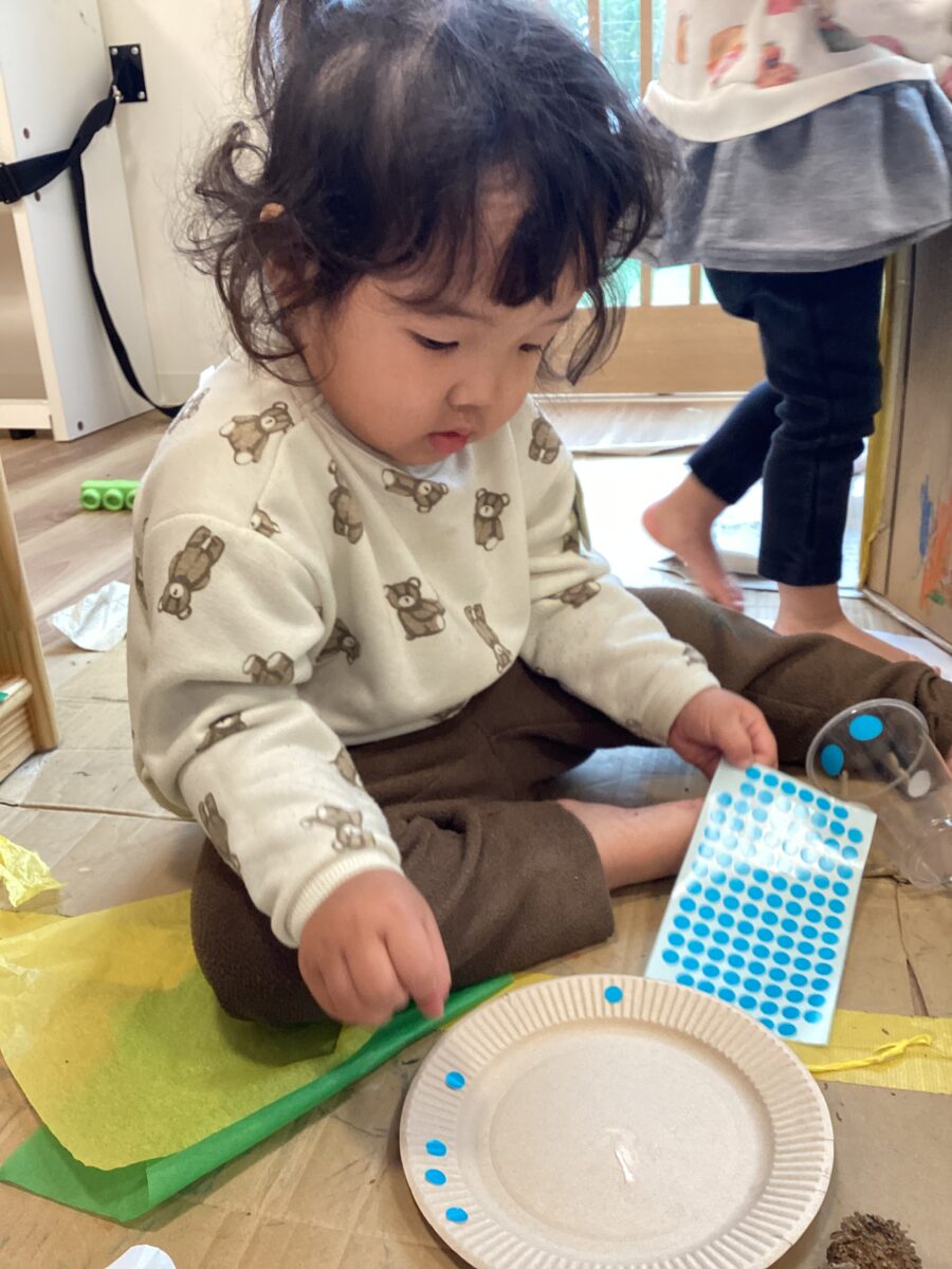 自分でボンドを使って手でいっぱい付けて、どうやったらお皿やカップに付くかな〜??と考えて貼っていましたよ