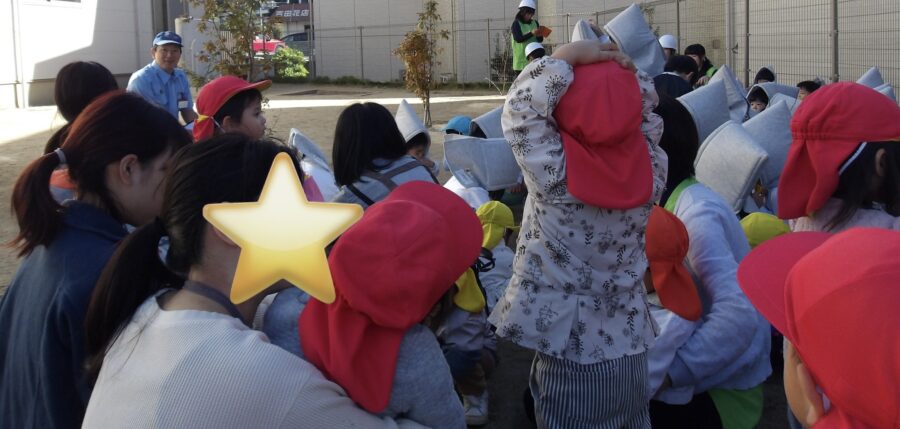 そら組さん、にじ組さん、たいよう組さんのお友達は防災布巾をかぶっていたので、それを見ていたお友達もいました 消防署の方のお話しも聞いていましたよ〜