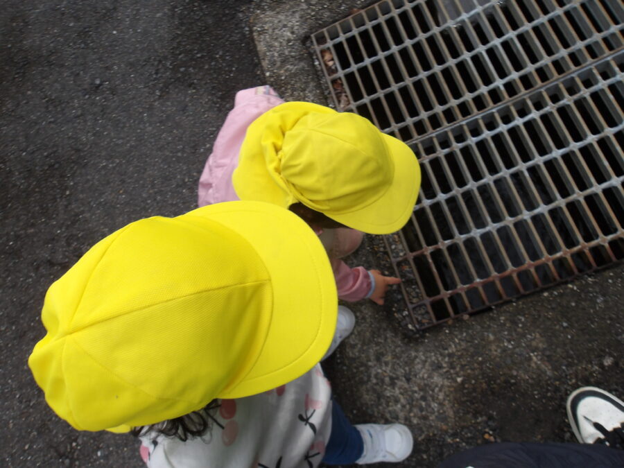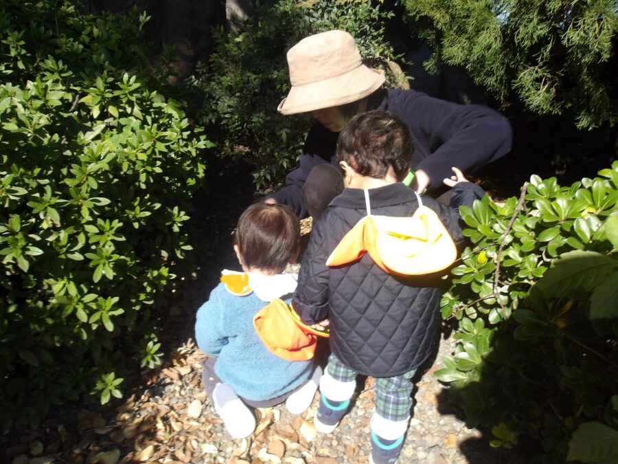あひる組さんは周辺をお散歩して、クリスマスツリーを見たり溝に何かいるか