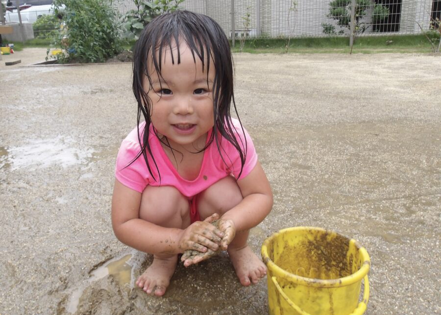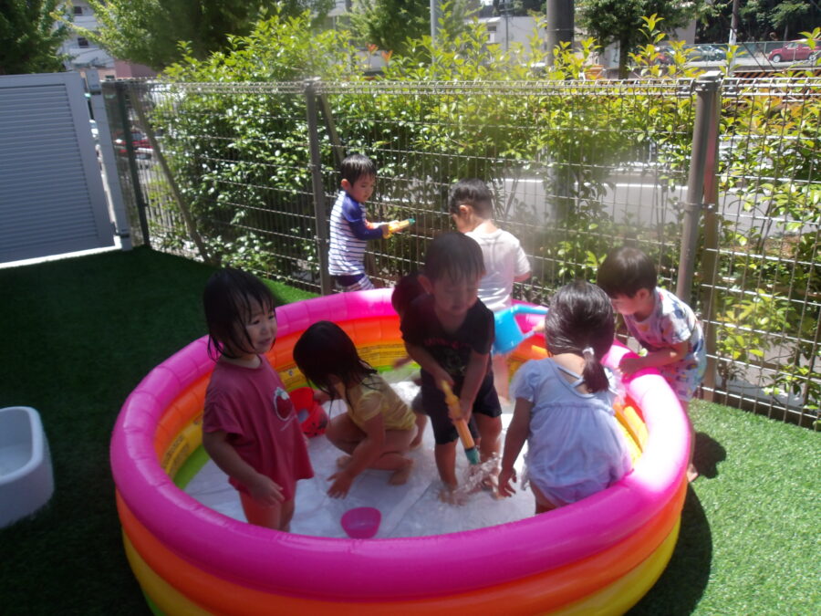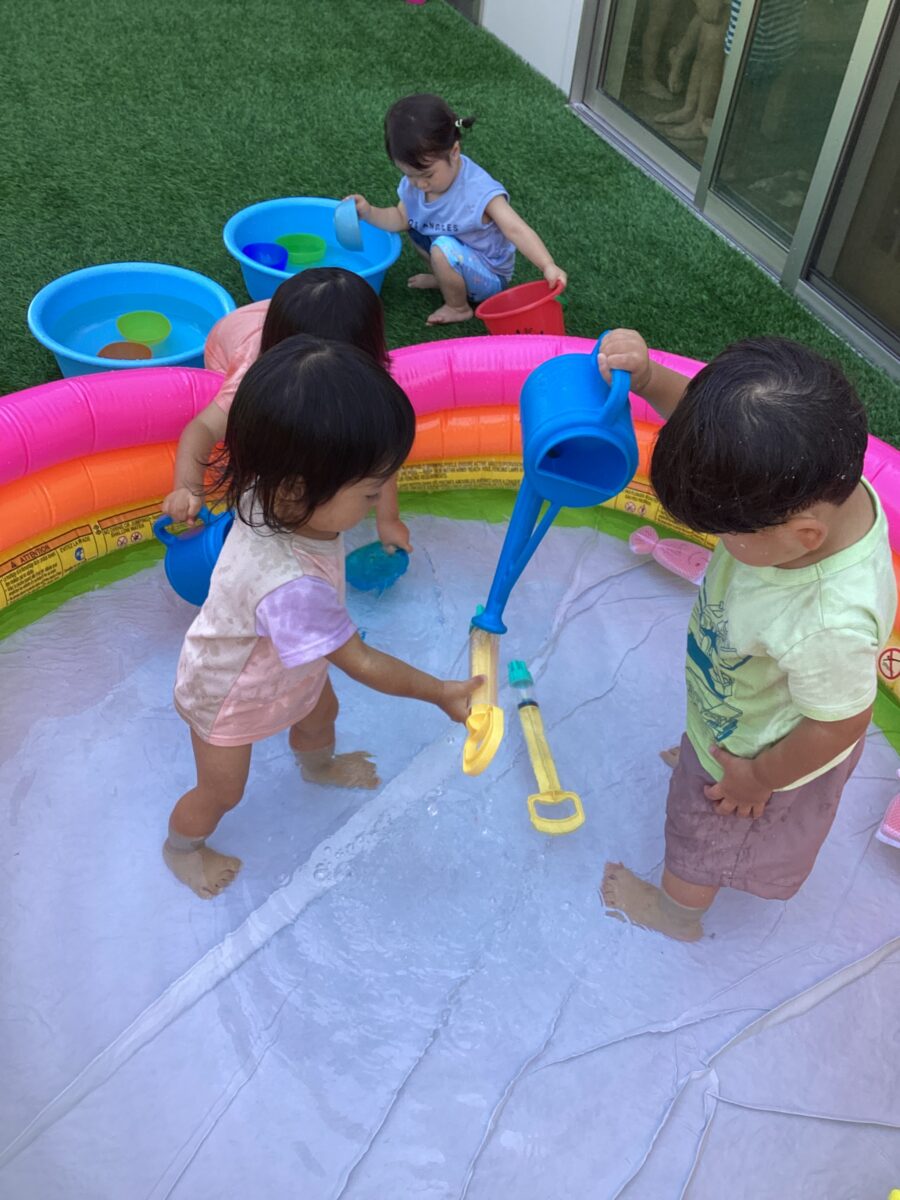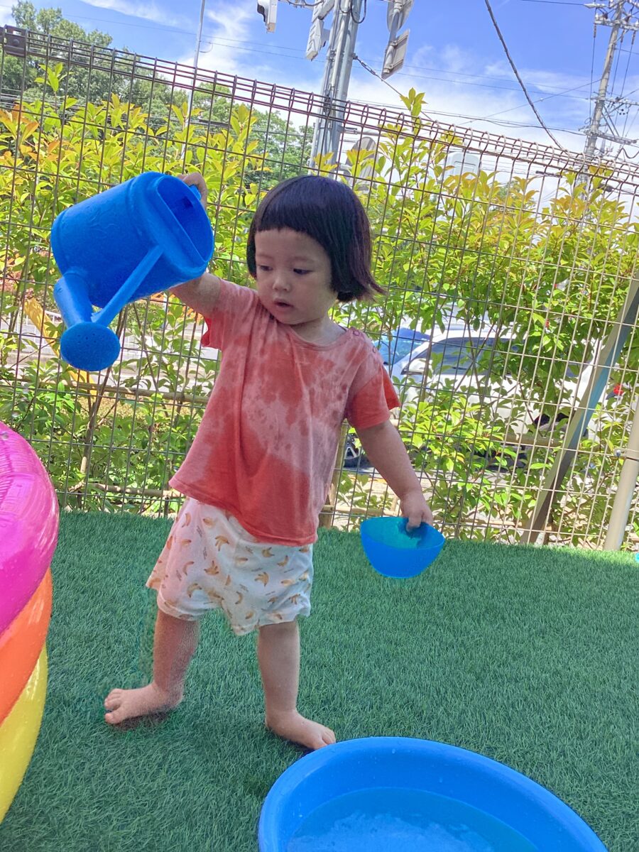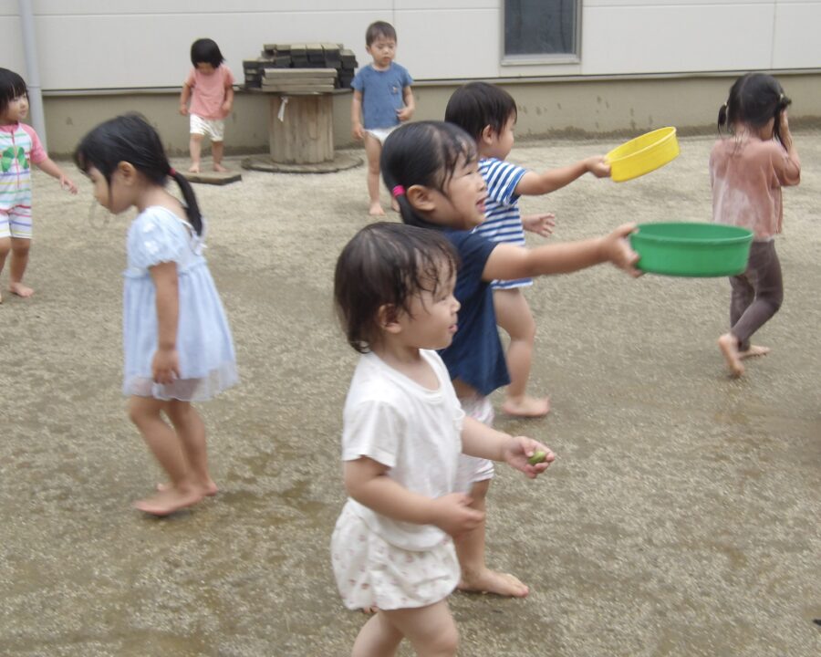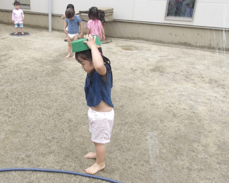 今日は園庭に出て、水遊びをしました。