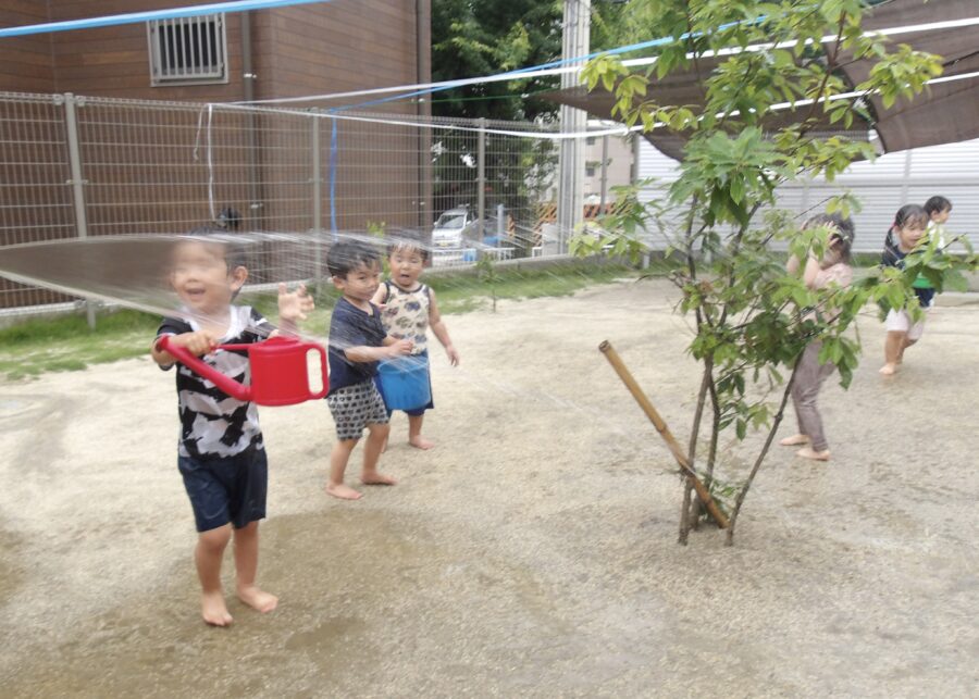 ホースで降らせた雨にみんな大はしゃぎ☔