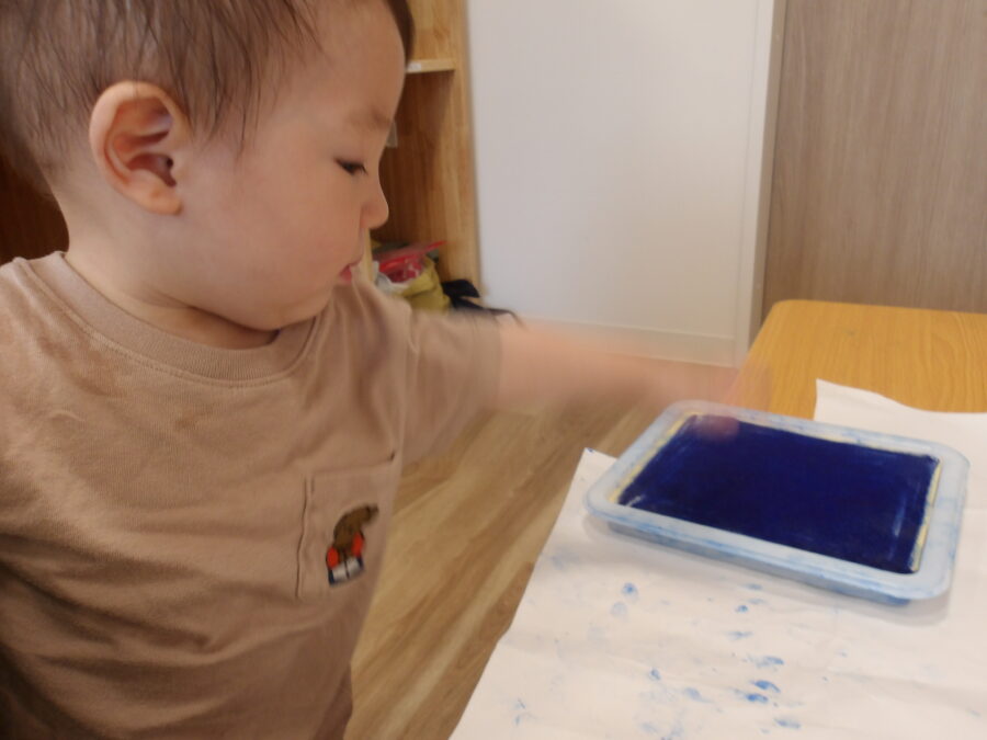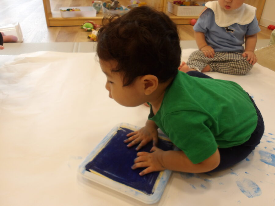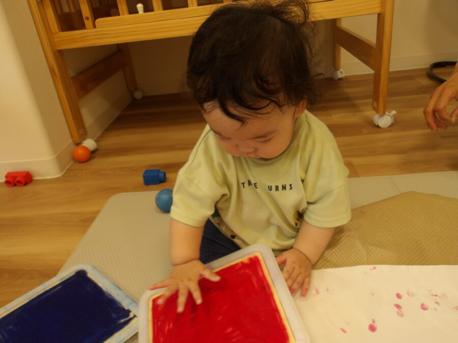 手につけるのが苦手なお友達には指にちょっとつけると、楽しんでペタペタしていました![]()