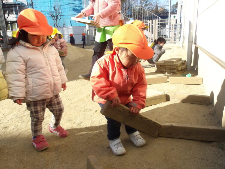 木の板では先生と一緒にお家を作ってままごと遊びをする様子が見られました🏠