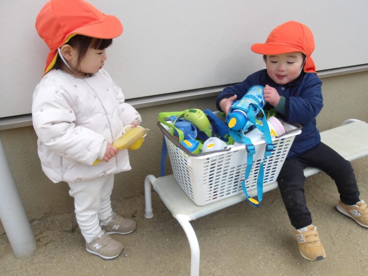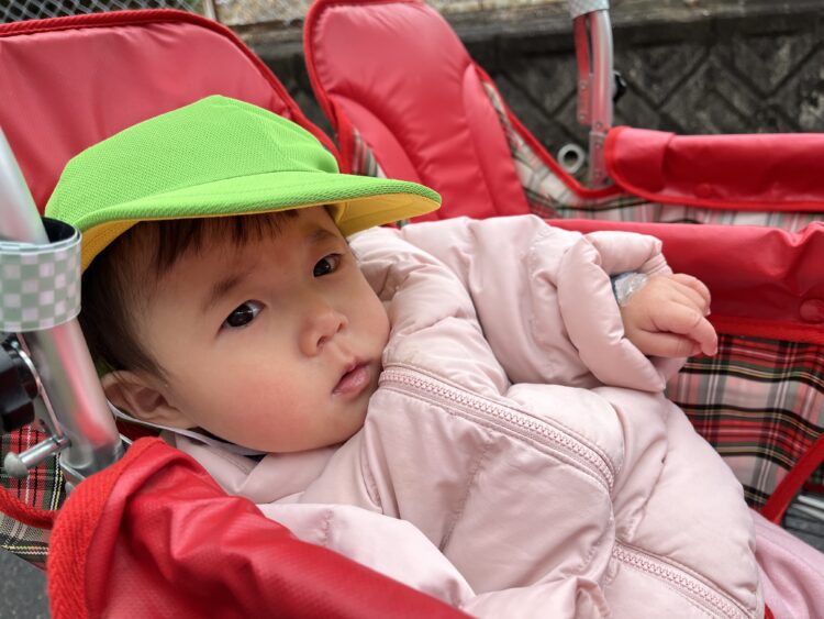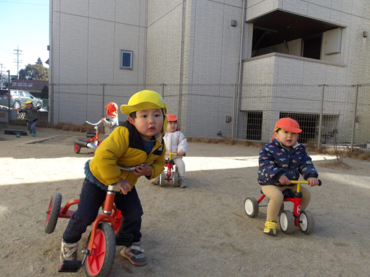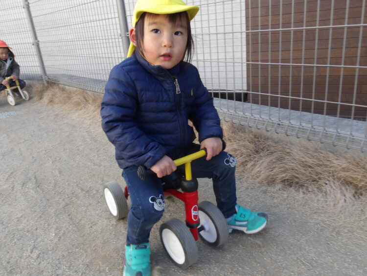 今日は寒かったのですが保育士とたくさん走って、おままごとや三輪車に乗って遊んでいました。