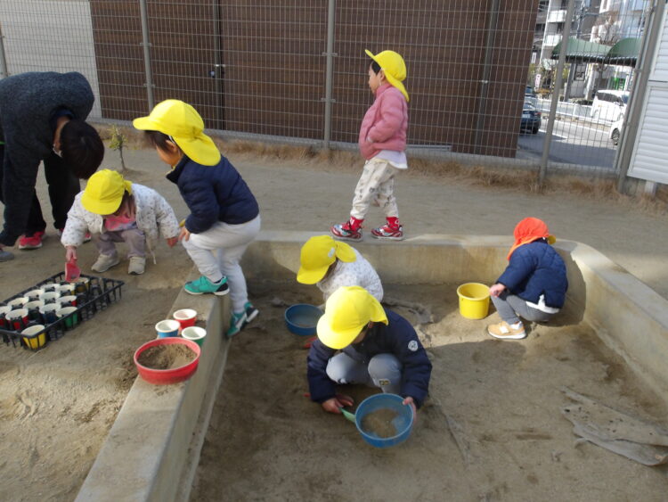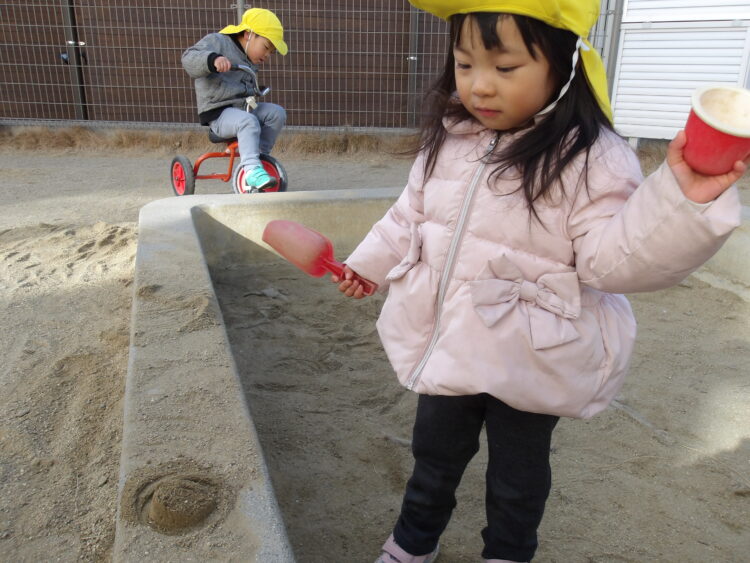砂遊びチームはみんなで大きな山を作ったり、コップに砂を詰めてケーキを作る子もいました🍰