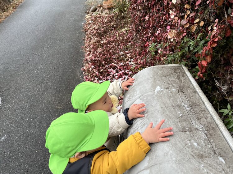 葉っぱの上に積もった雪をたいよう組さんと一緒に触ったり、先生とたいよう組さんが走って鬼ごっこをしているのを一緒になってついて走ったり、初めての雪の中の舎利殿を思う存分楽しみましたよ😊