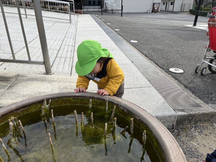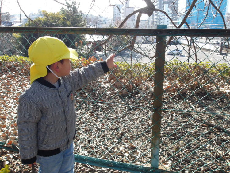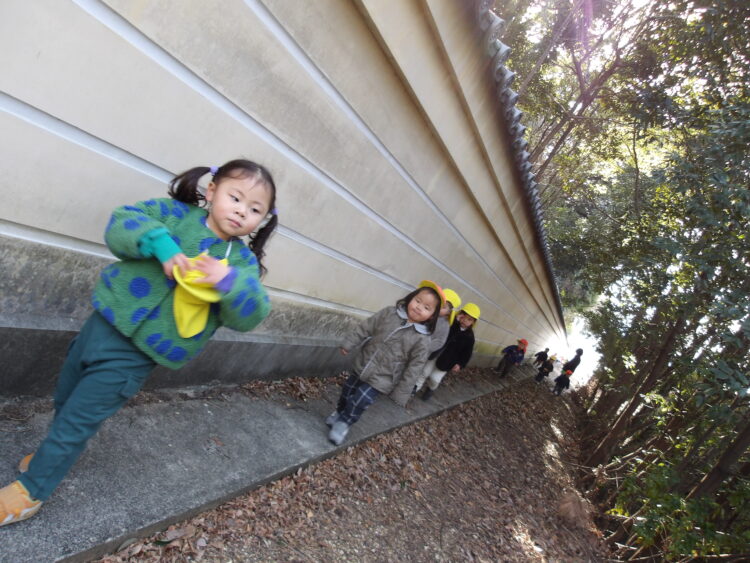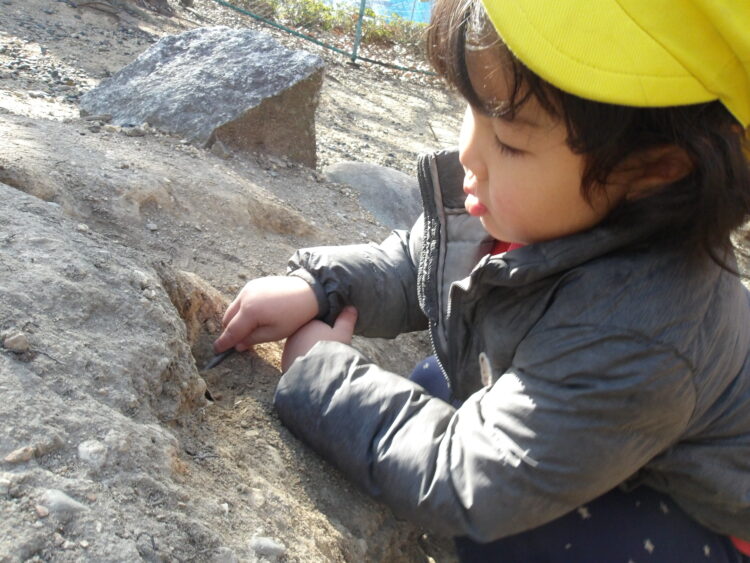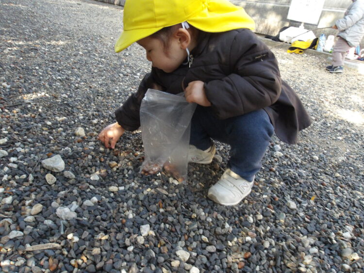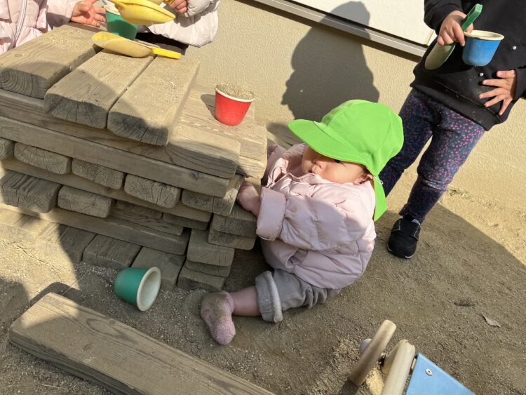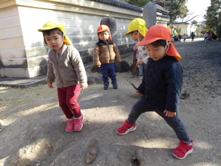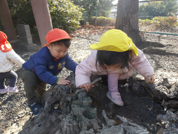 一緒に鬼ごっこをしたり、石を集めてままごと遊びをする様子が見られました!砂山の中を木の枝で掘る姿も見られました👀 袋の中にどんぐりや葉っぱをたくさん入れました✨ 切り株の中に入ってお家ごっこもしました🥰今日は舎利殿の奥まで探検にも行きました!
