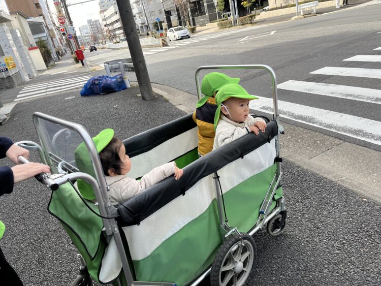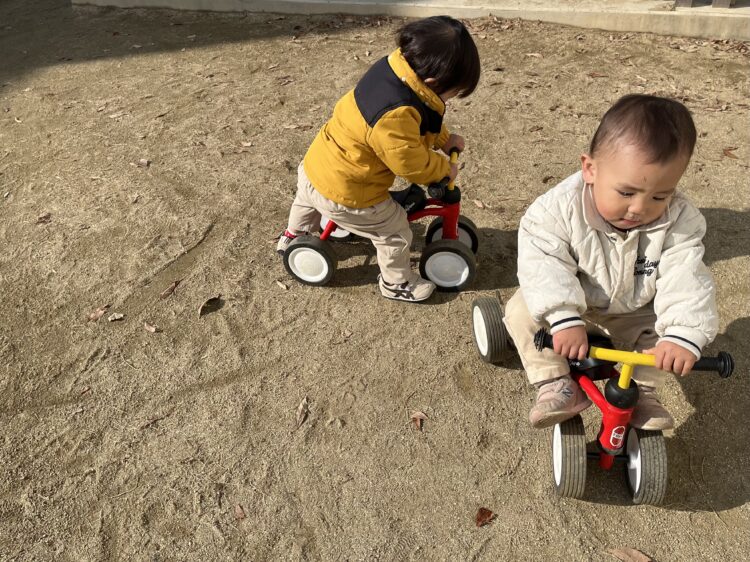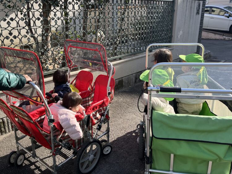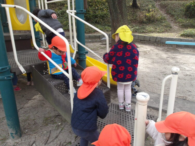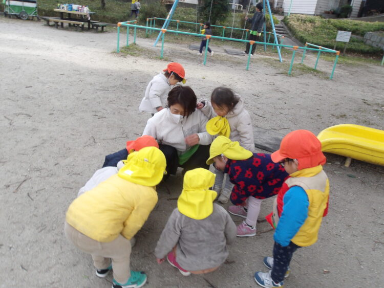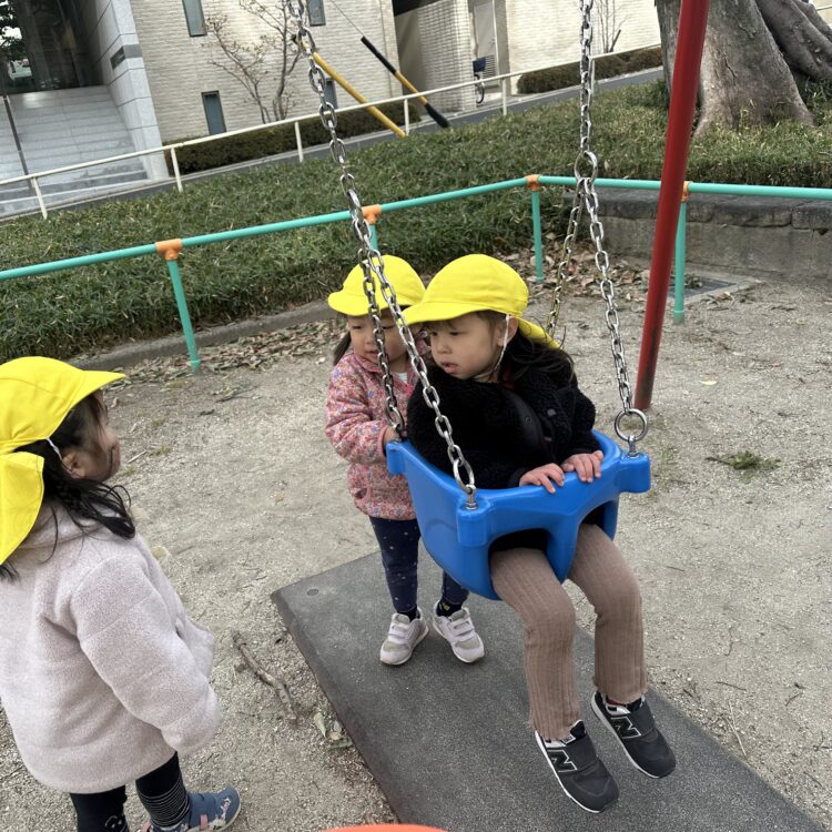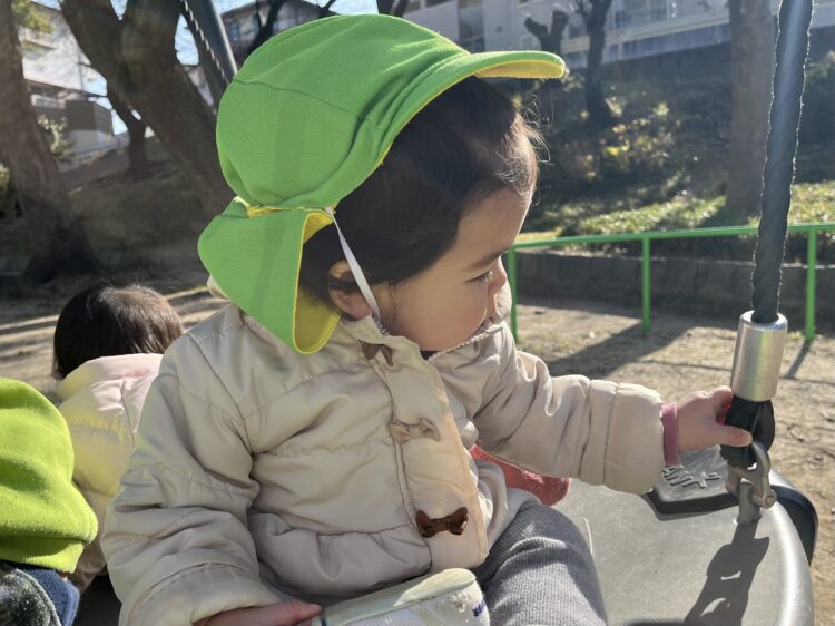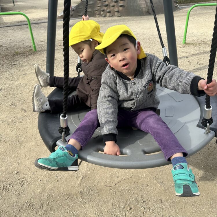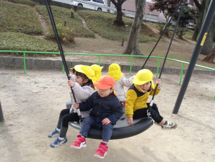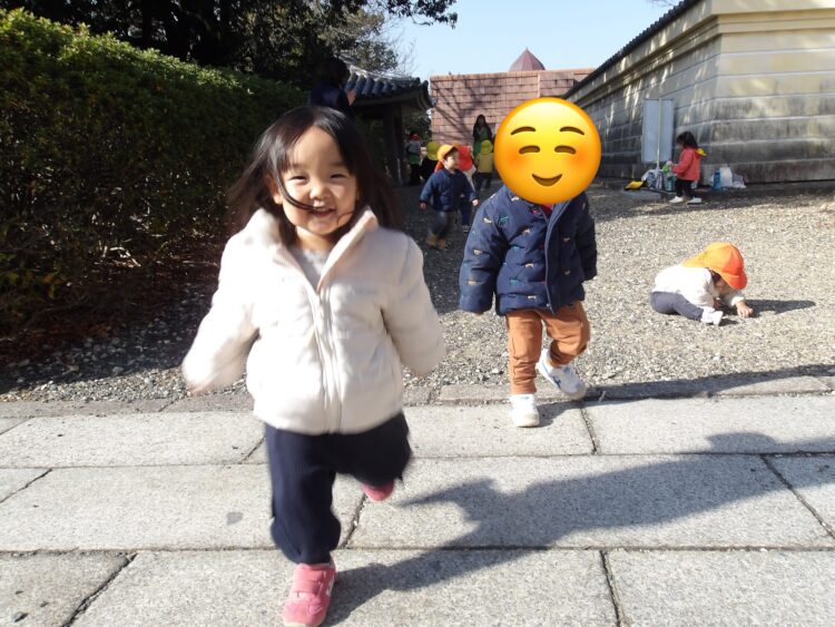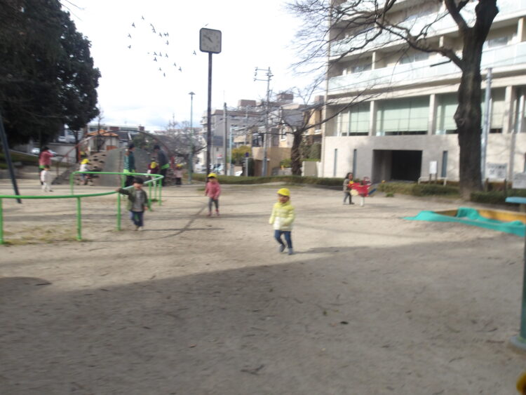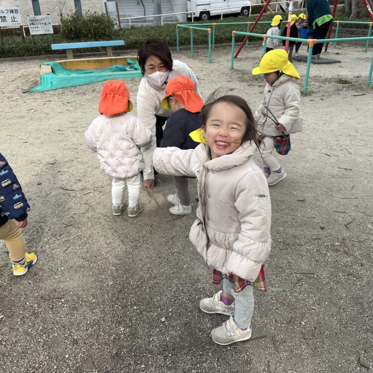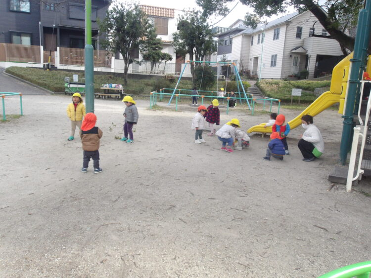 今日は西山公園に行きました。丸型ブランコや滑り台は大人気! 地面にお絵描きも始まりました! 先生がおばけを描いてくれたよ👻   寒かったのでかけっこもしましたよ元気いっぱい遊べました😄