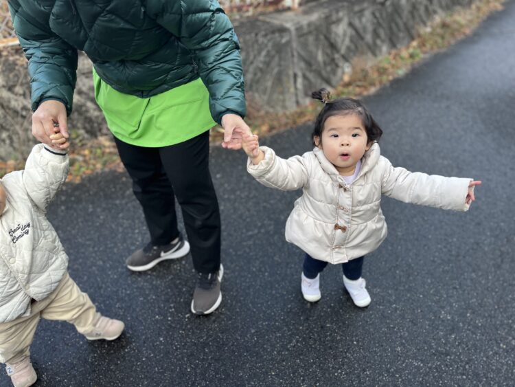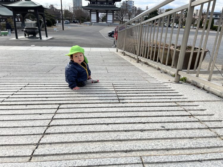 お参りに来た人にも笑顔で手を振っていました。 本堂に行くスロープを歩いていったり、ハイハイで来ました