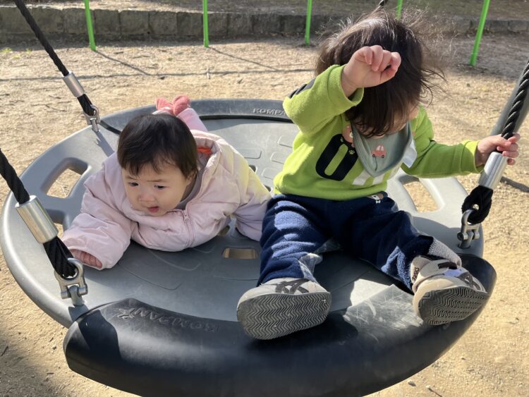 公園のおうちに犬がいるかなと見に行きといなく帰ろうとしたら犬が来てくれ、「ワンワン」と言ったり指差しをして教えてくれました 円盤に乗るとしっかり持って楽しんでいました