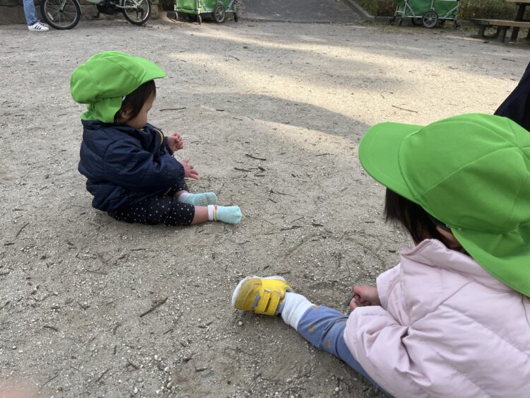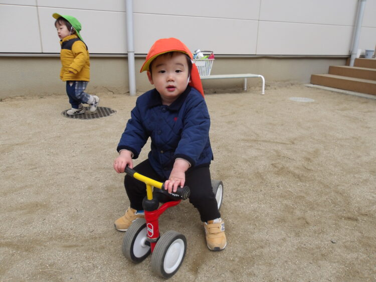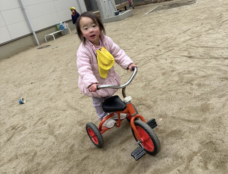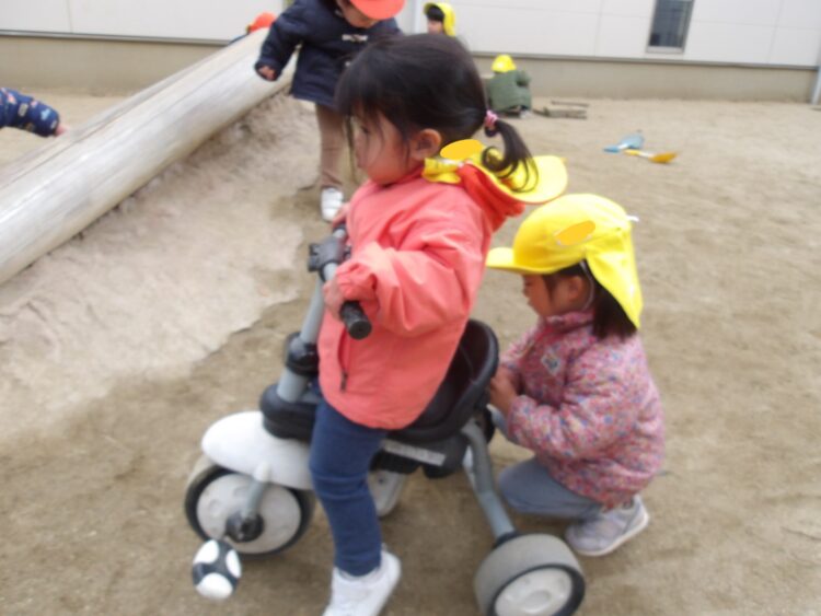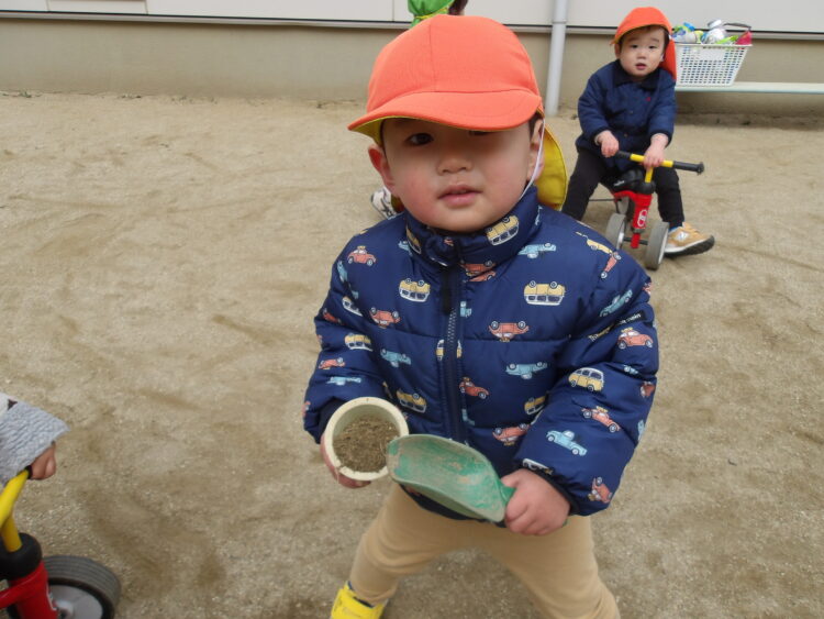 お友達とコップに砂を入れてケーキを作ったり、お店屋さんごっこをする様子が見られました🥰 三輪車や手押し車で遊んだチームはお友達を押して手伝う姿が見られたり、お友達と一緒に走ったり、漕ぐ姿が見られました😊