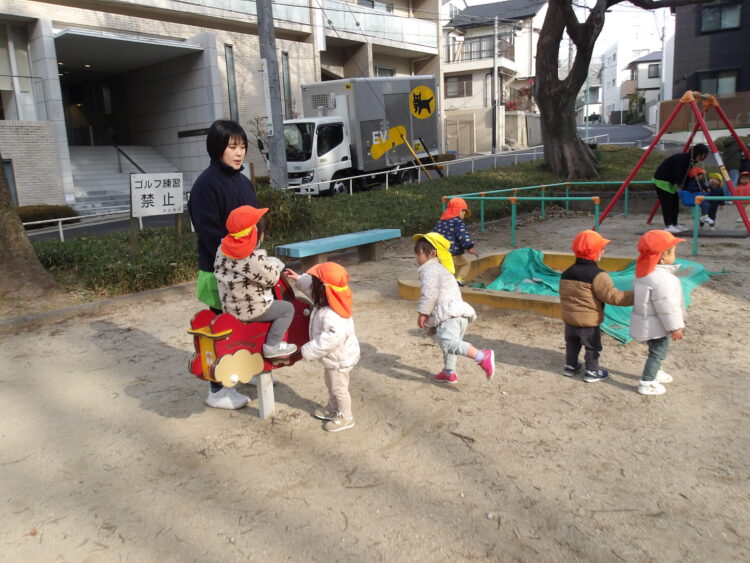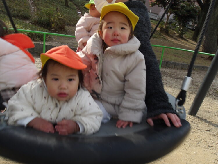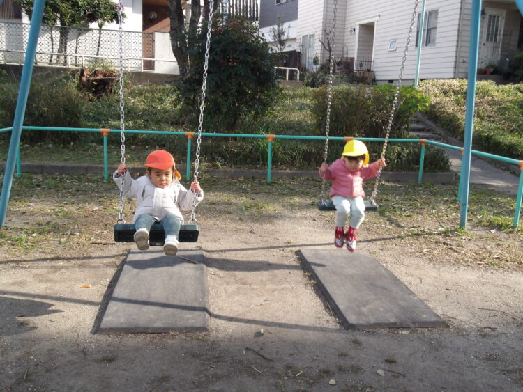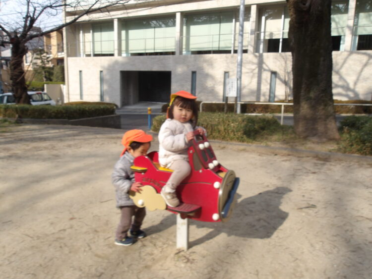 「かして!」と言い順番待ちをしたり、自分の番になったら笑顔であそんでいました🥰  お友達や先生と一緒に乗ってゆーらゆらと揺れていました! お友達の遊具を押してお手伝いをしている姿がありました✨ ブランコにも挑戦!!