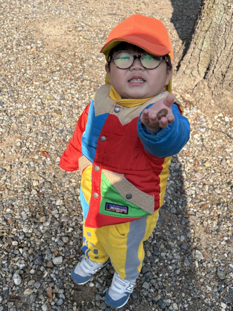 「どんごり(ぐり)ー!!」と大きな声で手に拾ったりどんぐりを見せてくれたり、どんぐりの頭を持ってきてくれたりしましたよ