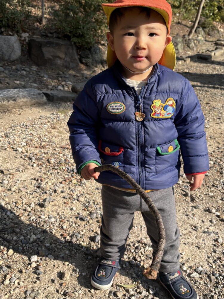保育士と手を繋ぎ歩きました 坂道を登ったり、降りたり楽しみ、石を見つけると見つめていました明日も遊ぼうね