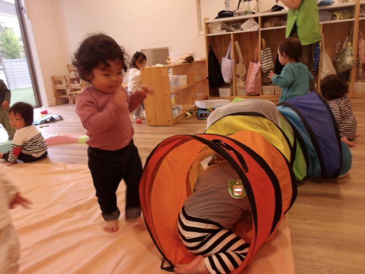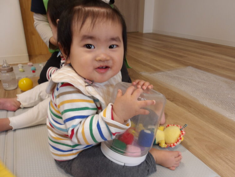 子どもたちは好きなおもちゃを手に持ち遊んでいました  笑顔もたくさんでてきましたよボールを持って何回もたたいて遊んでいましたよ