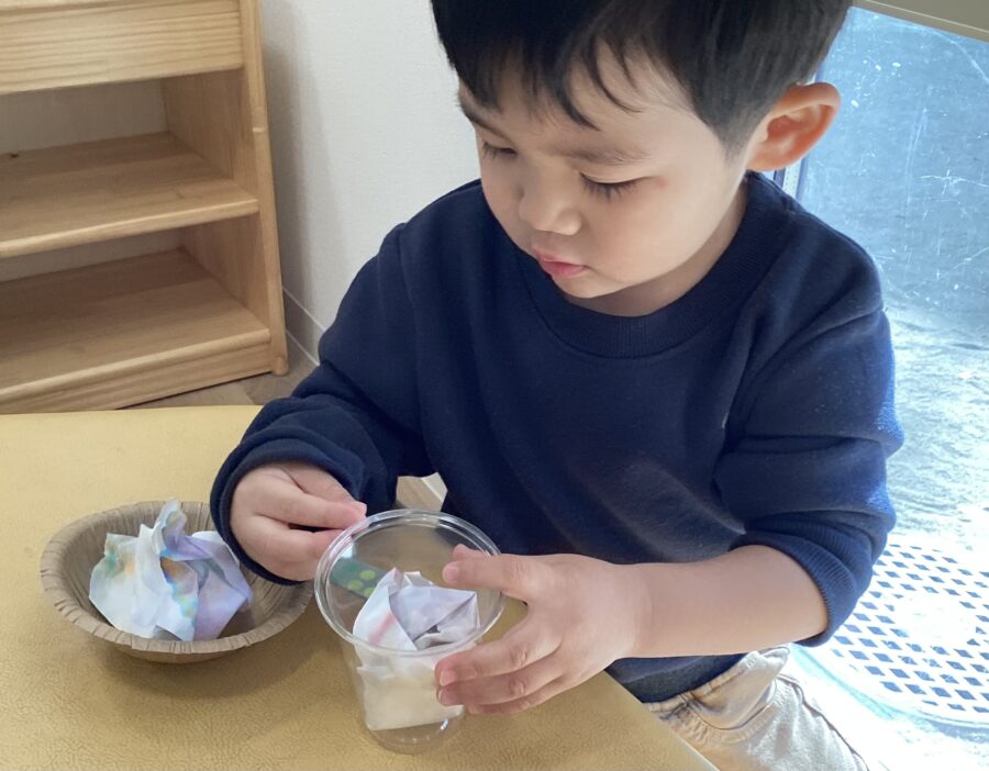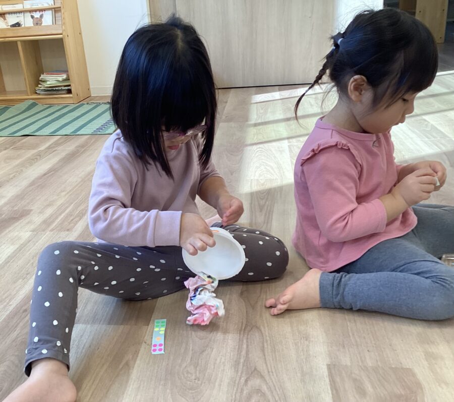 「アイスクリームがいい」「ケーキ」などいいながら紙を丸たりちぎったり、シールを貼ったり思い思いの作品ができていましたよ  みんなで真剣に取り組んでいました