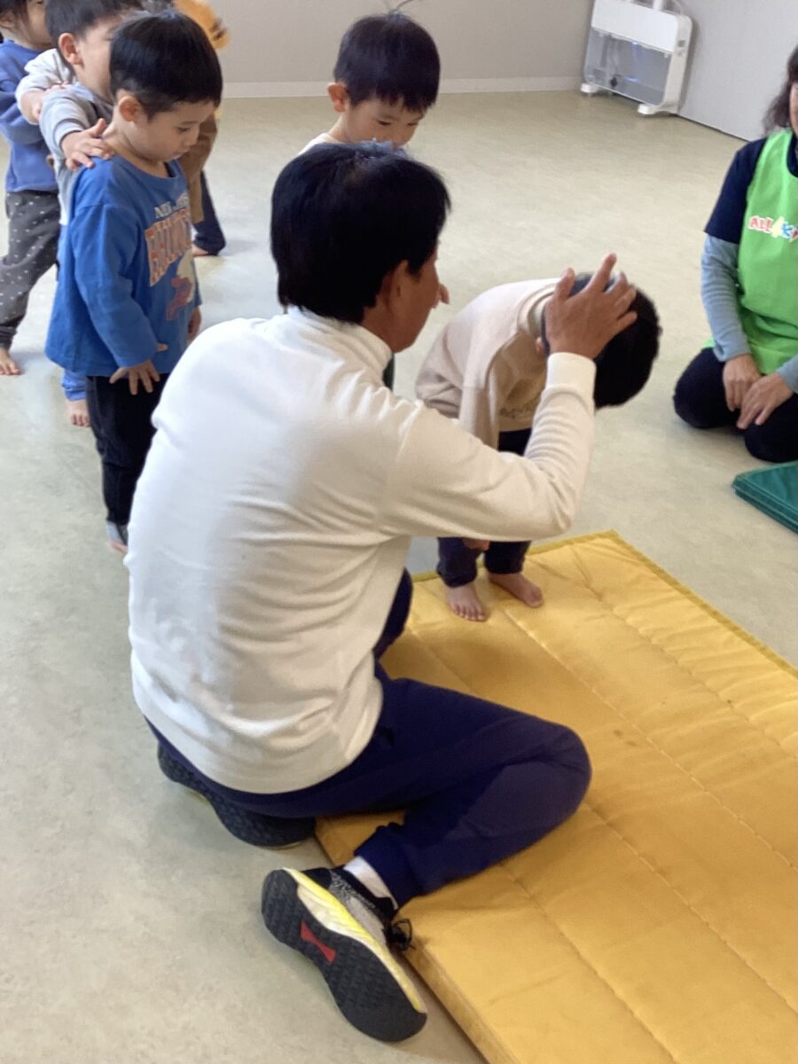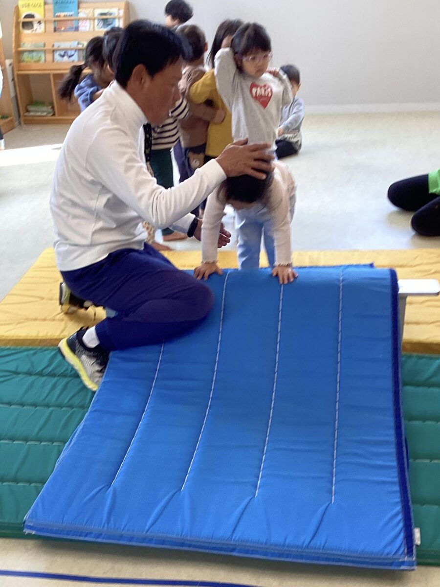 ギッコン、バッタンと練習をしてからの体操の先生の補助付きで前まわりをしました  あひるさんは、園庭で好きなところで遊んでいました