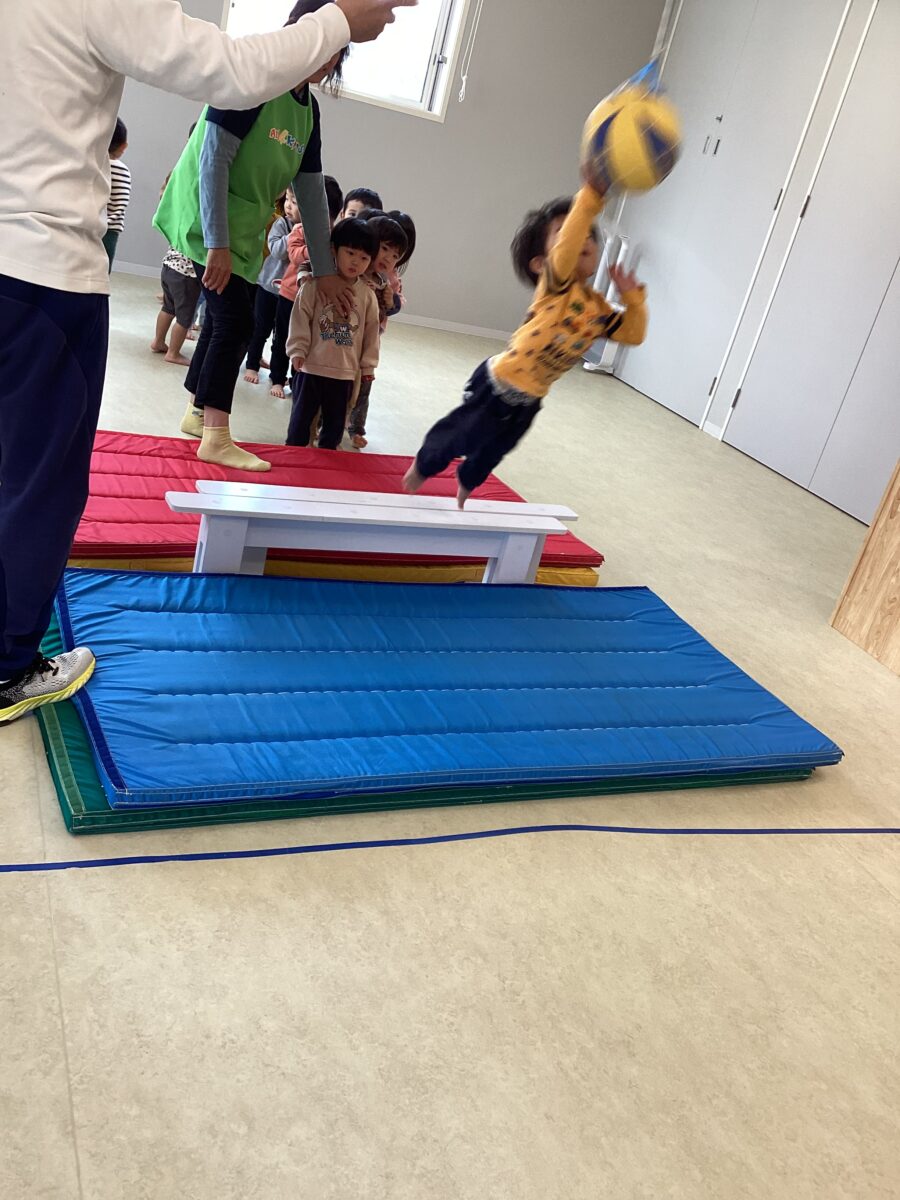 平均台の上を登るのを怖らがらずに乗り、ボールにタッチをしていました 前まわりをしました