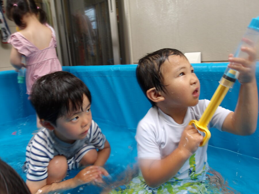 「せーのっ!」で息を合わせてバタ足をして水しぶきをあげて楽しんだり、手や水鉄砲で水の掛け合いをして楽しんでいましたよ