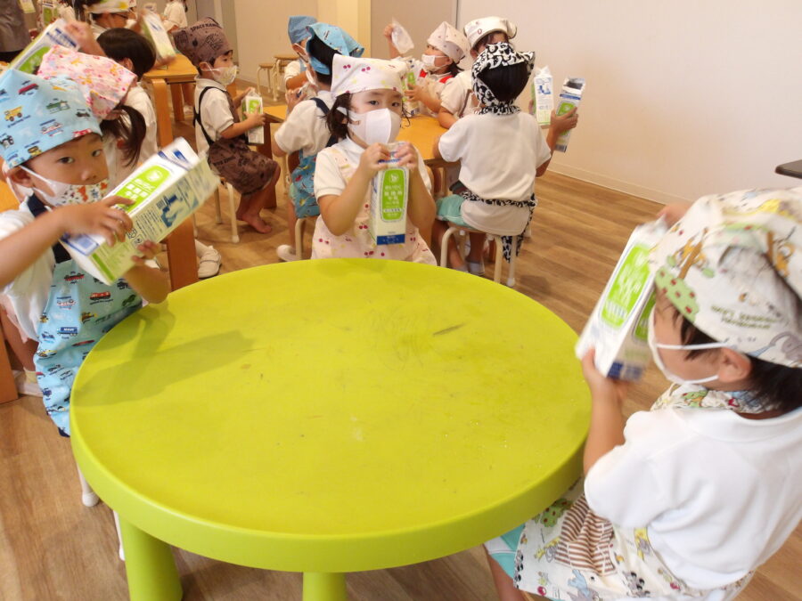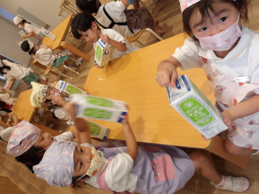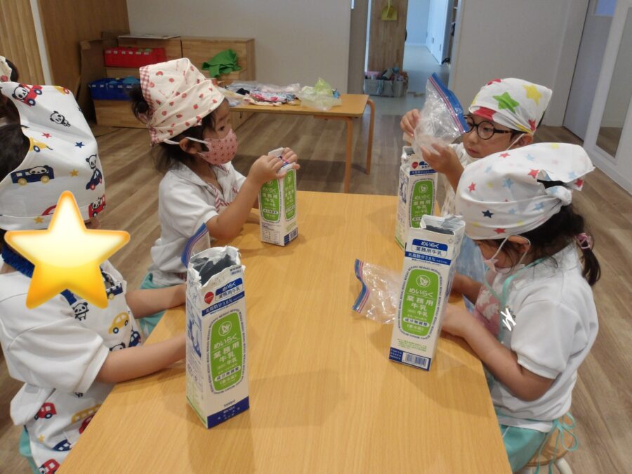 まずは袋に氷と塩とジュースを入れてシェイク!!!みんな楽しく牛乳パックを振りました☺️