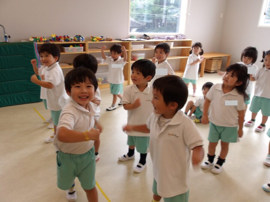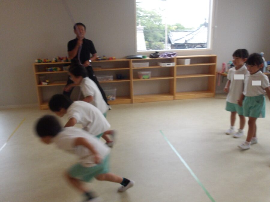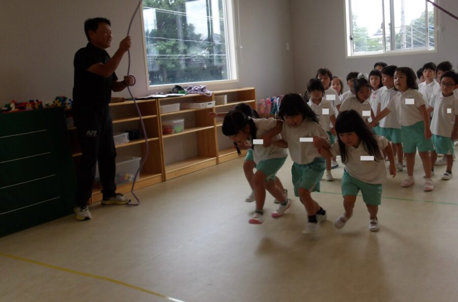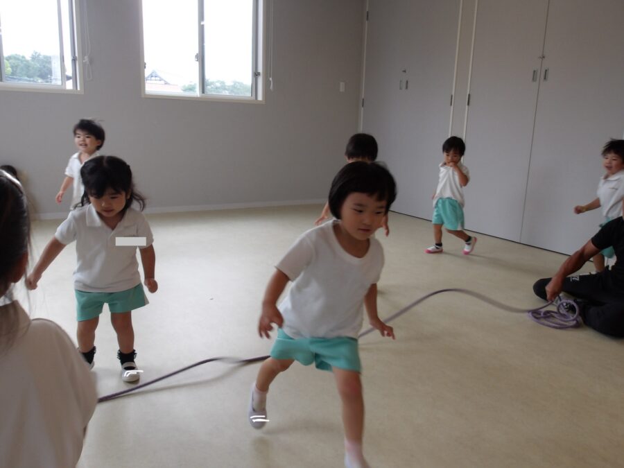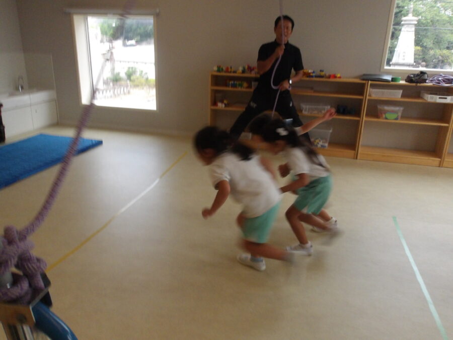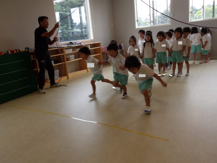 長縄では、みんなで手を繋いで通ったり、ジャンプしてから逃げたりなど、