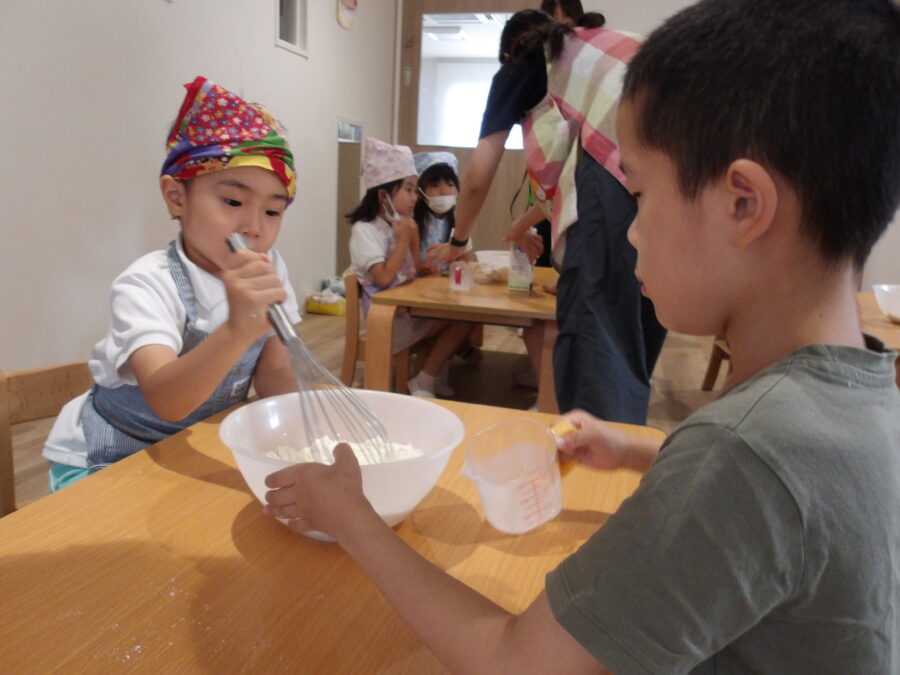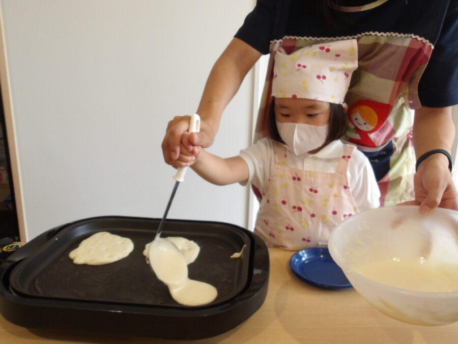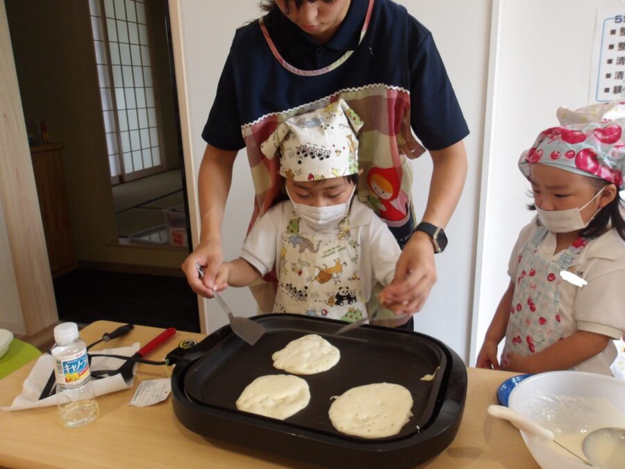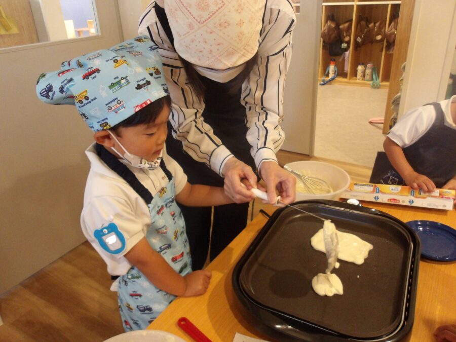 「トロトロになった!」と子どもたちが伝え、保育士が確認した後はホットプレートに生地を入れ、一緒に焼きました![]()