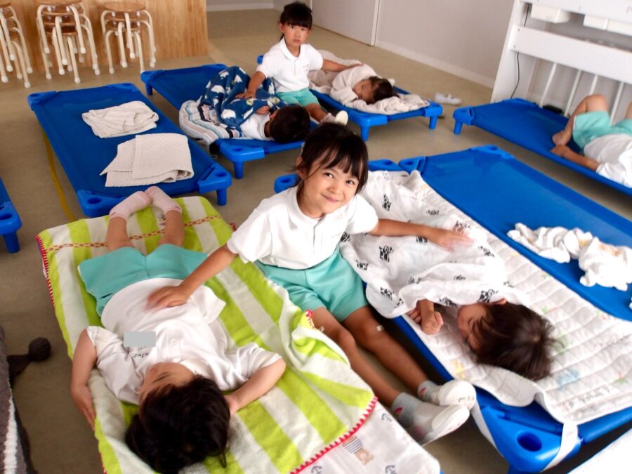 お昼寝の時間には「トントンしてあげようか?」と仲良く遊んでくれたお姉さんたちが来てくれて、嬉しそうに眠っていました![]()