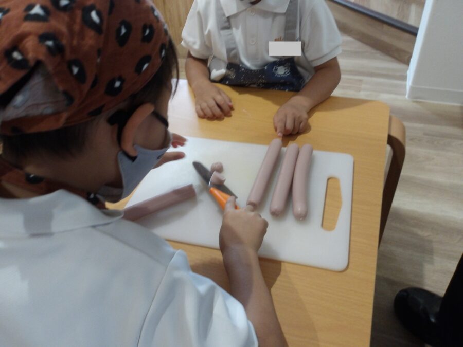 中に入れるおさかなソーセージのカットにも挑戦しました![]()