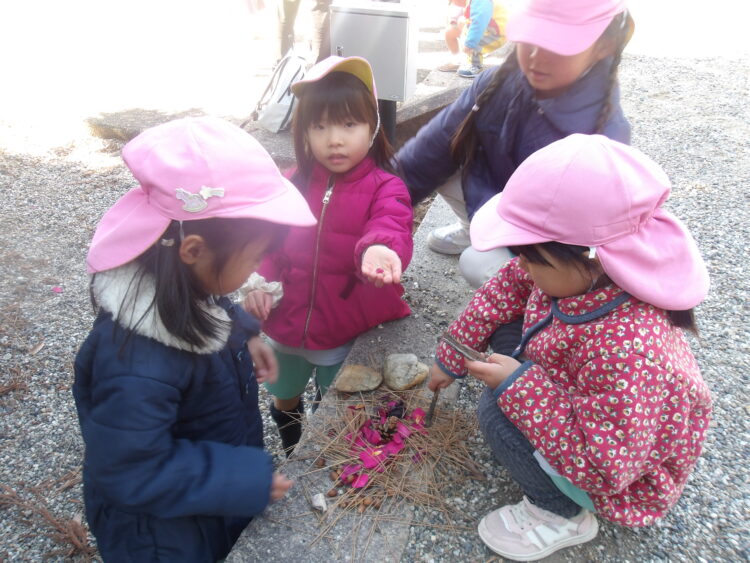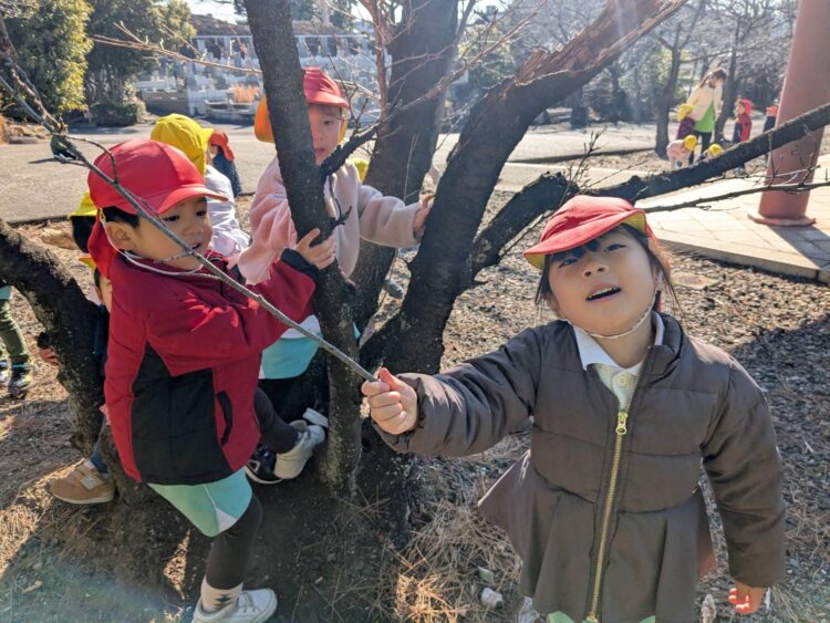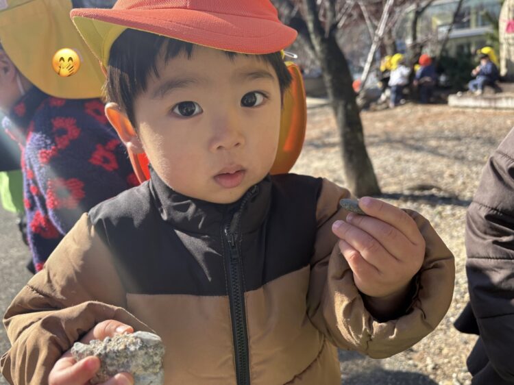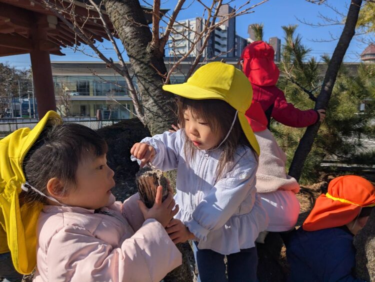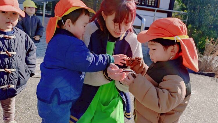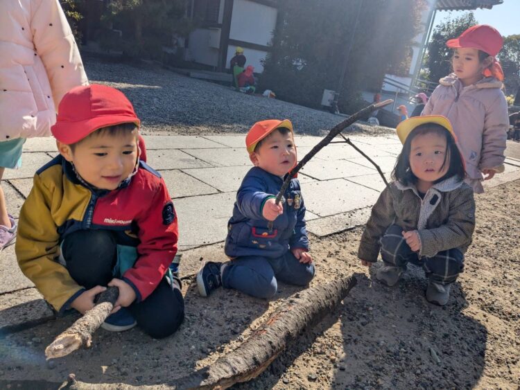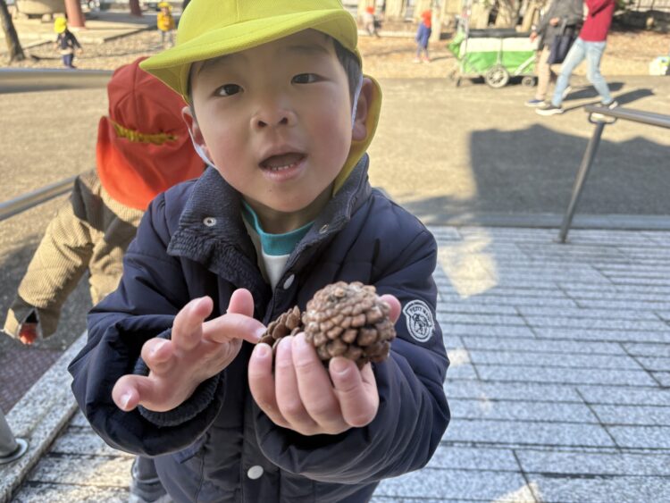 ぽかぽか陽気の中、みんなは松ぼっくりやどんぐり拾いをして楽しんだり枝を使って演奏会ごっこをしたり、鬼ごっこをして楽しんだり…