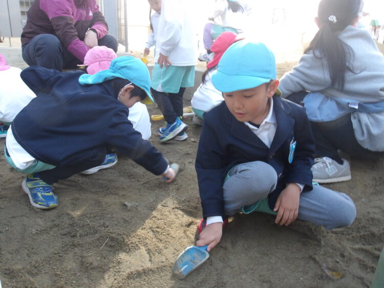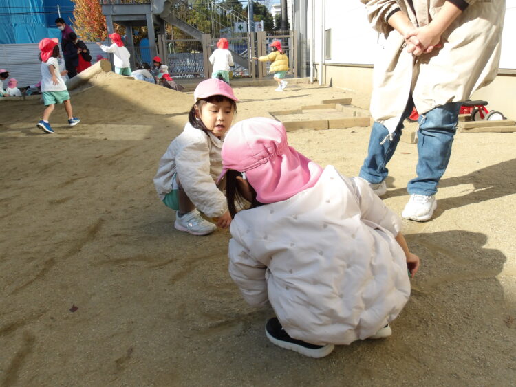 どんぐりや松ぼっくりを拾ったりしていた子どもたち。