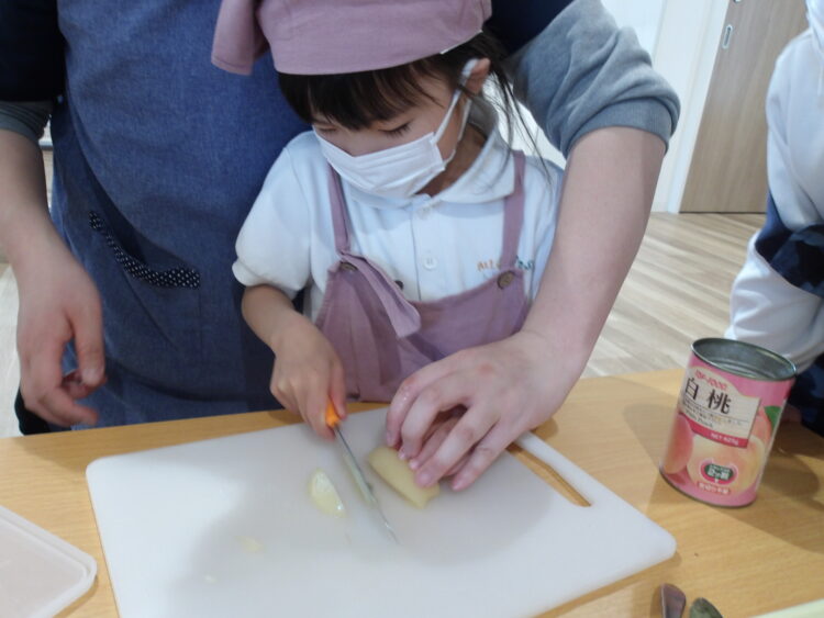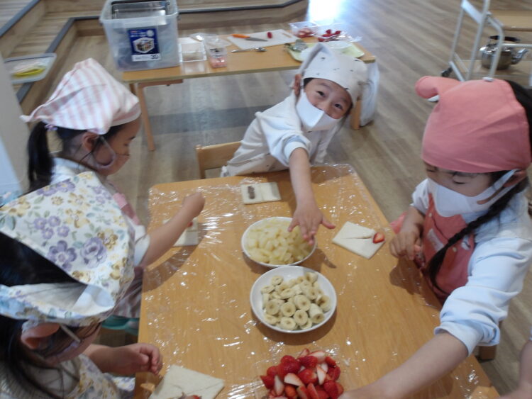 パンを半分に切って、バナナや桃、いちごもcutし
