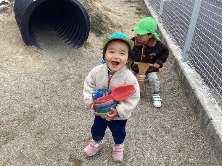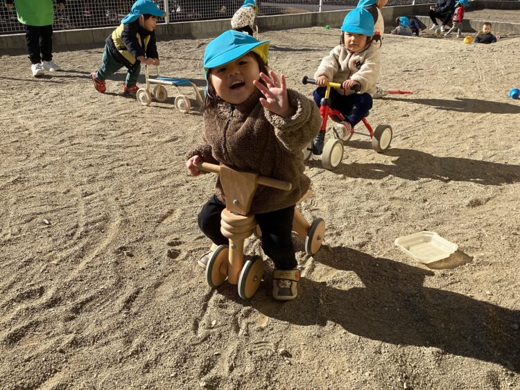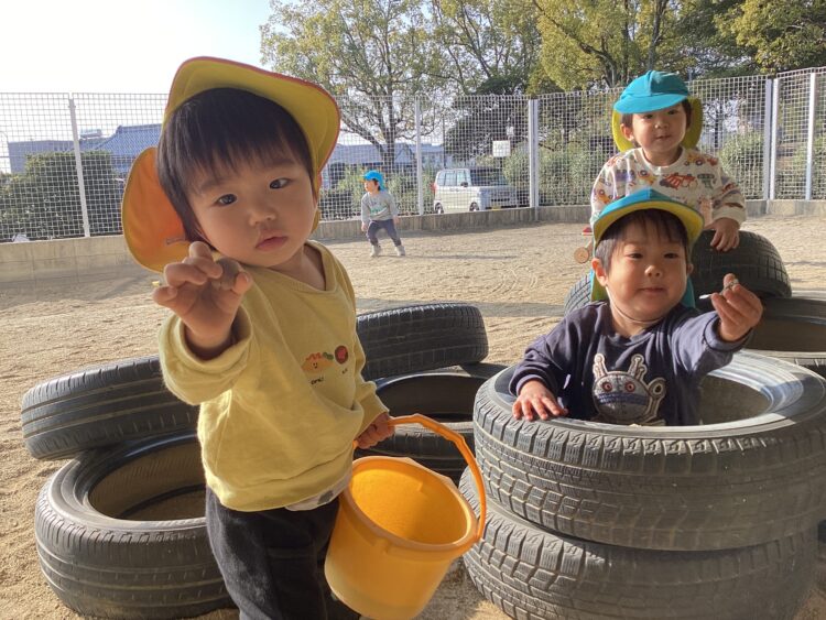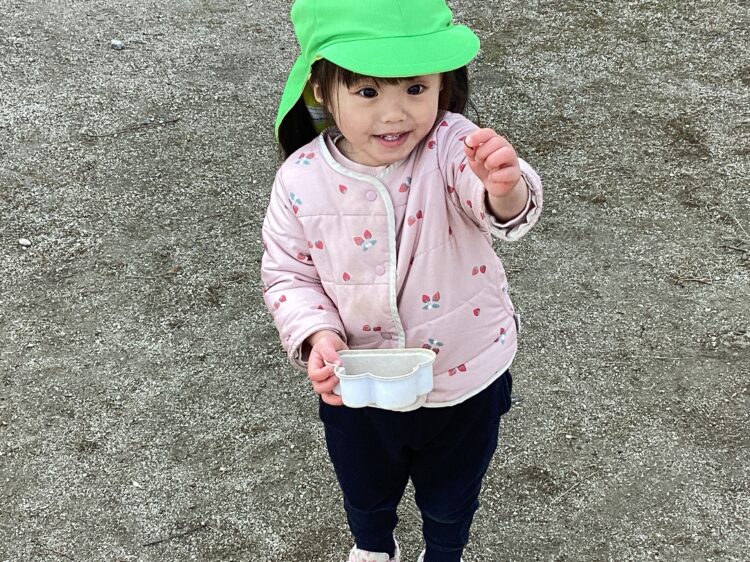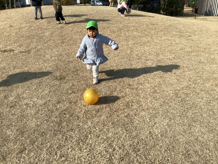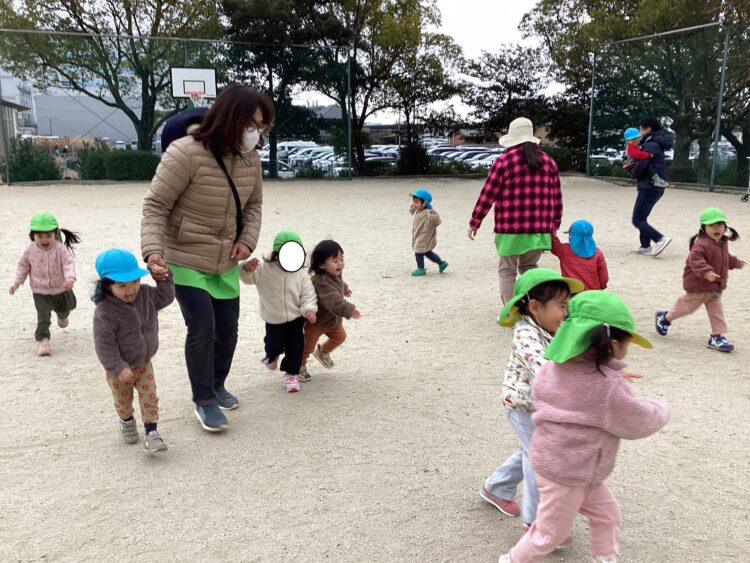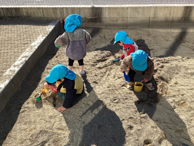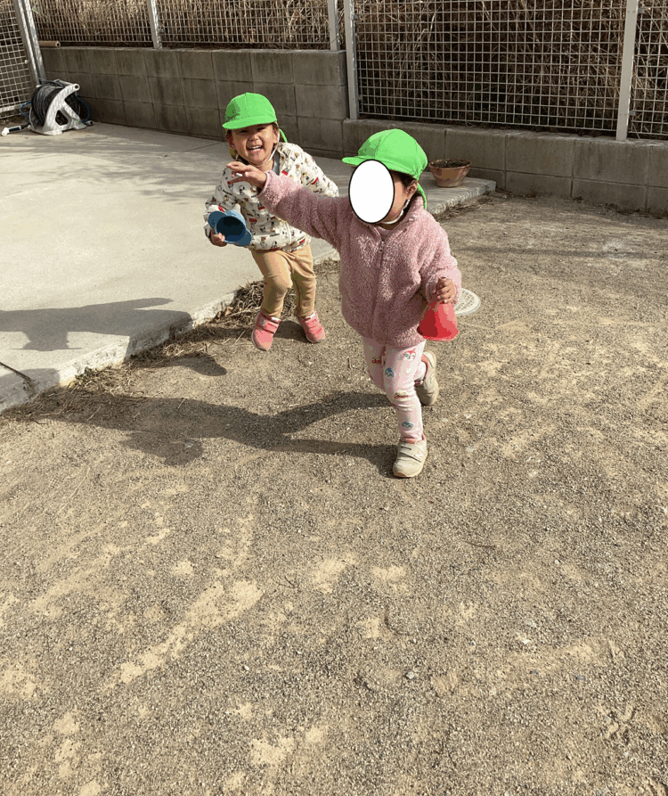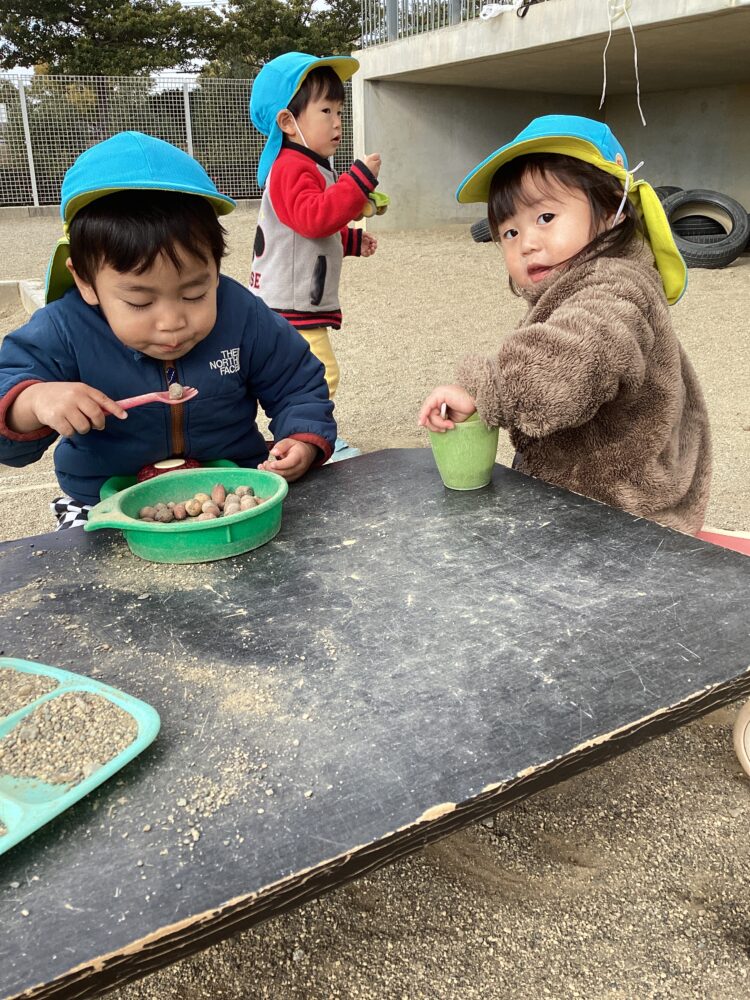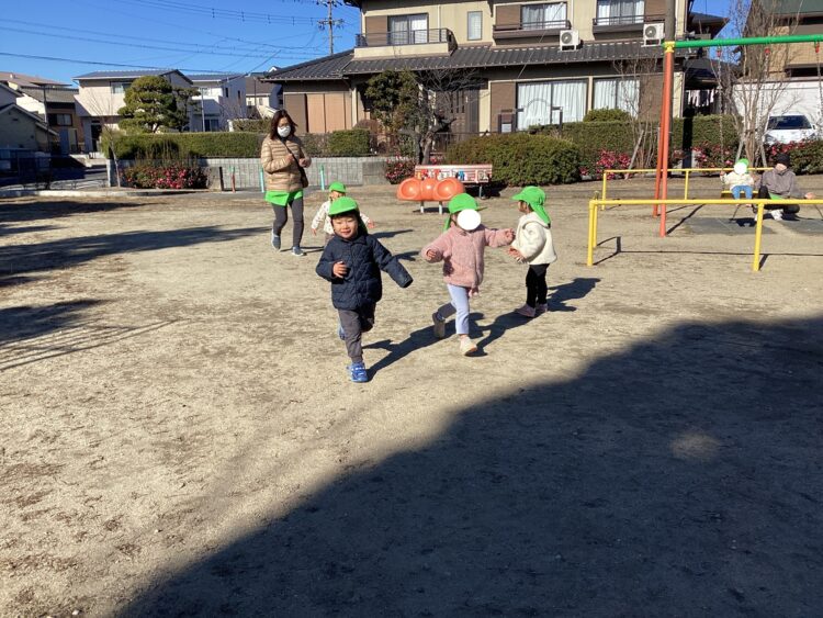 遊んでいる途中であられが降ってきましたが、寒さにまけずみんな元気いっぱいです