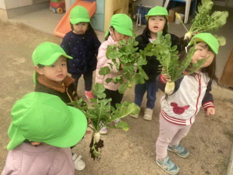 のびのびさんが植えた大根が大きくなってきたので、みんなで間引きをしました。