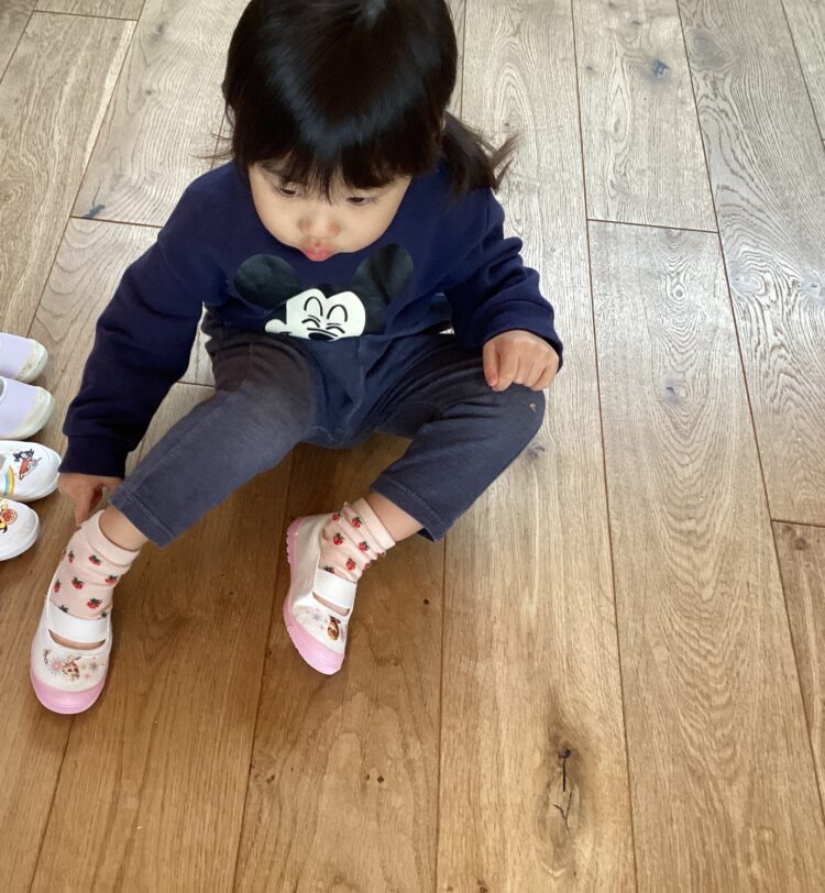 のびのびさんは上靴を履いてお兄さんやお姉さんのお部屋に遊びに行きました。