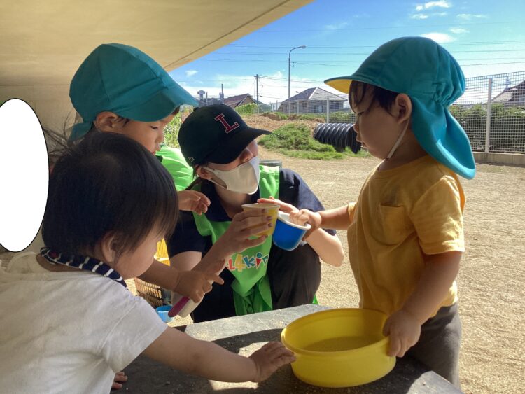 園庭では先生と一緒に「かんぱーい