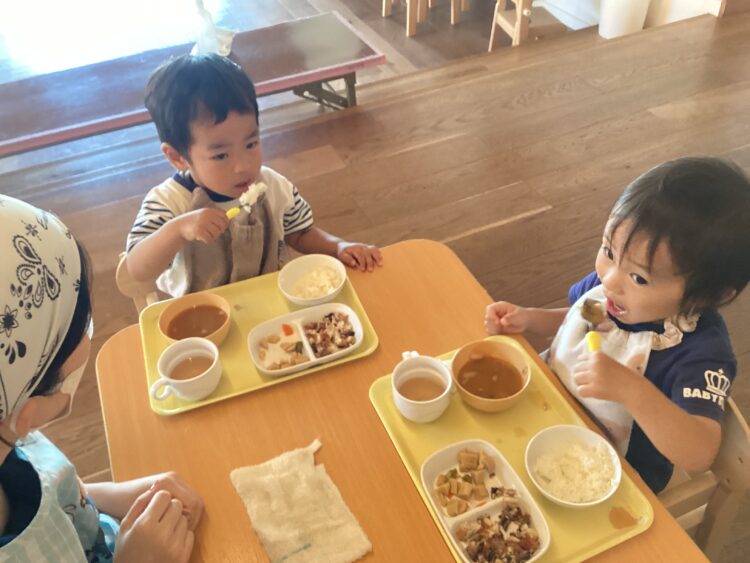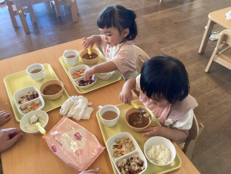 いっぱい遊んだ後は美味しい給食の時間![]()
