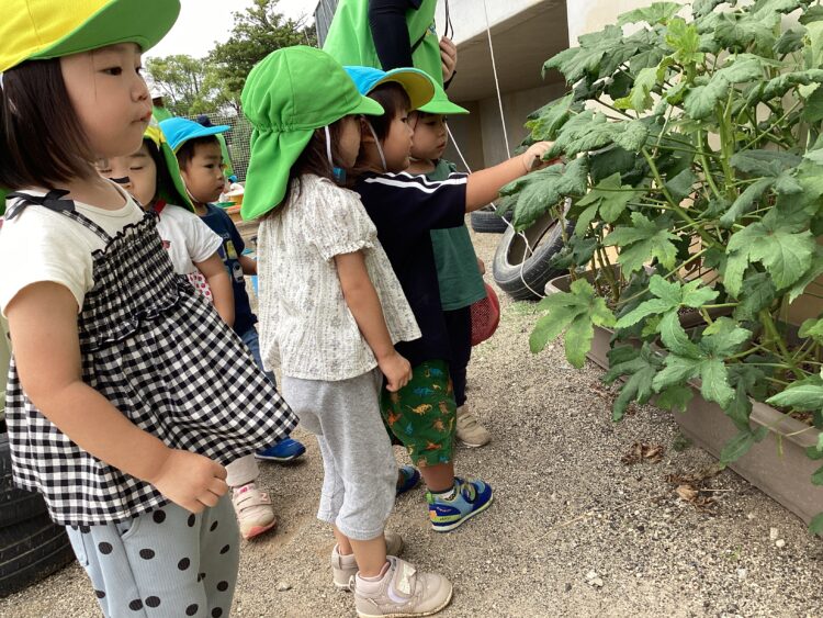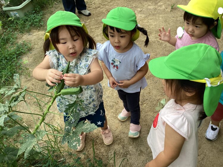 園庭に出てみると大きいオクラにびっくり!