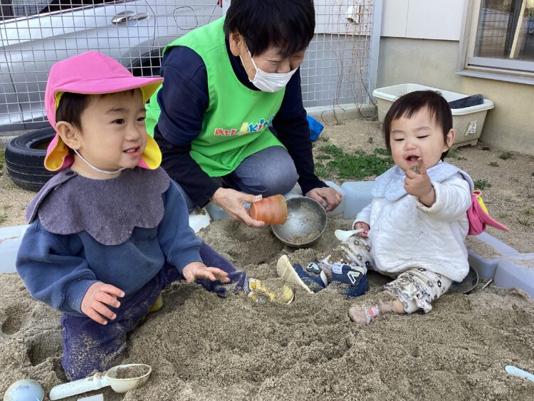 今日は朝のおやつを公園で食べました。お外で食べると、気持ちいいね![]()