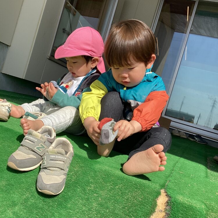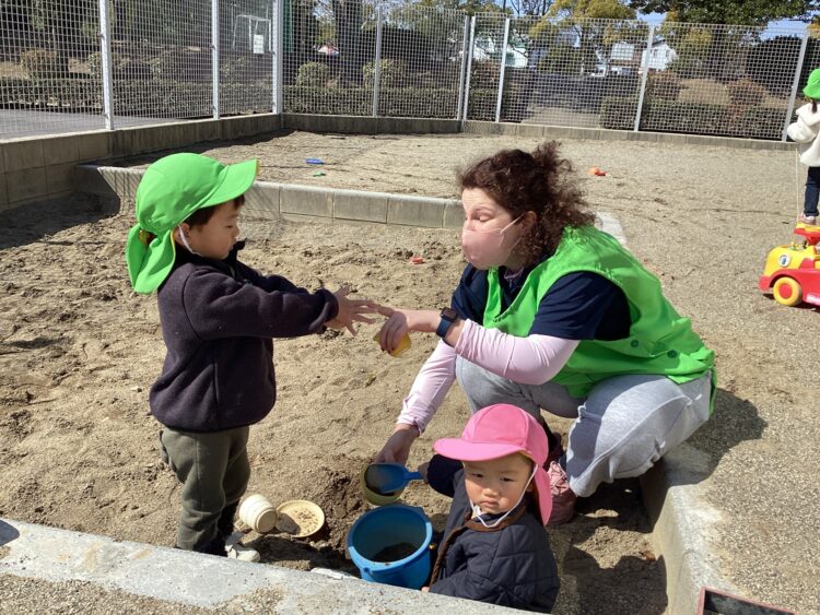 お砂場ではお友だちや先生とコミュニケーションをとって遊んでいました![]()